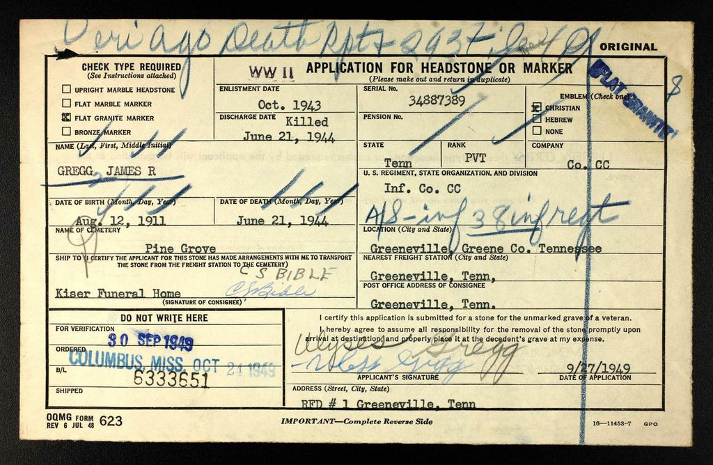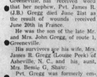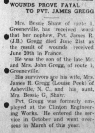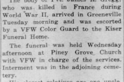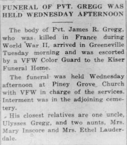 The body of Pvt. James R. Gregg, who was killed in France during World War II, arrived in Greeneville and was escorted by a VFW Color Guard to the Kiser Funeral Home. The funeral was held at Piney Grove Church. Interment was in the adjoining cemetery. His closest relatives are one uncle, Ulysses Gregg, and two aunts, Mrs. Mary Inscore and Mrs. Ethel Lauderdale.