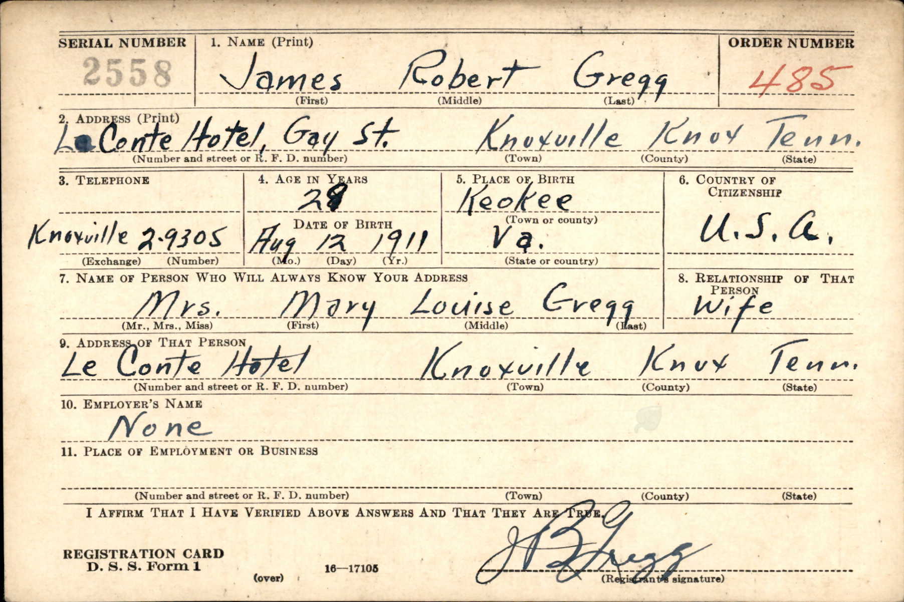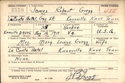 James Robert Gregg was born on 12 August 1911 at Keokee, Virginia, the son of John Gregg. He was the husband of Mary Louise Peek.