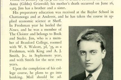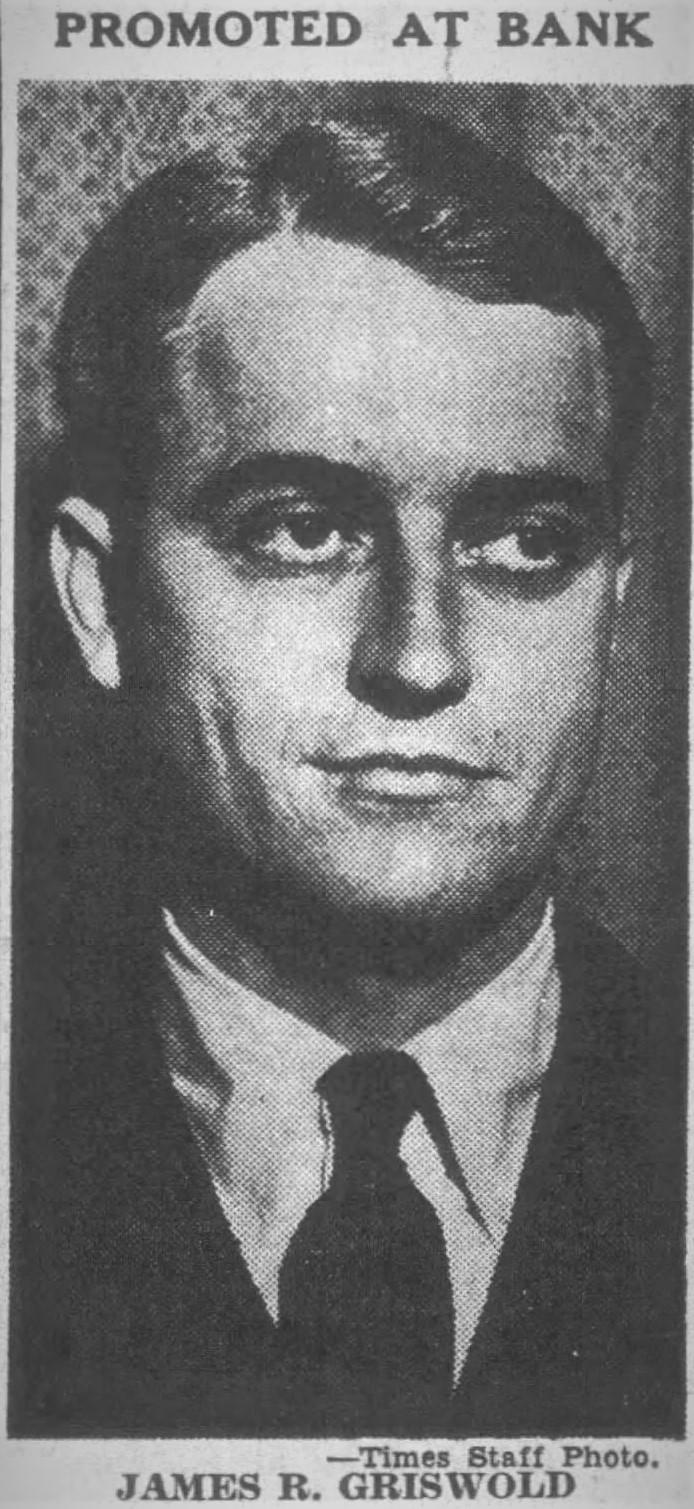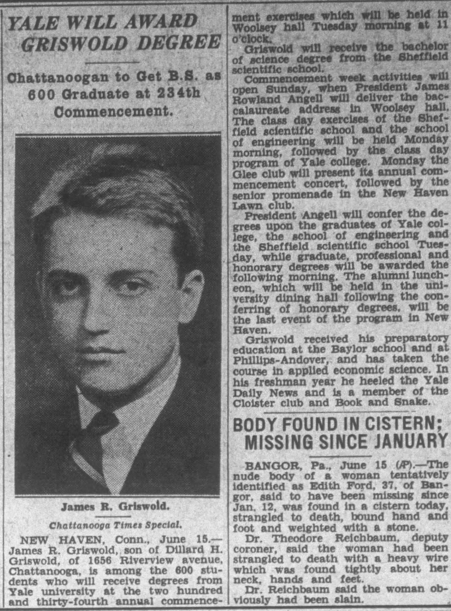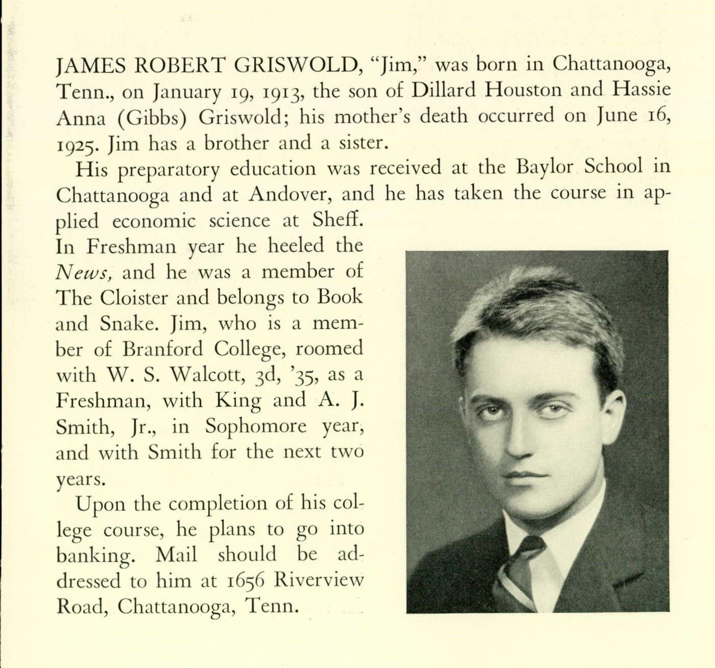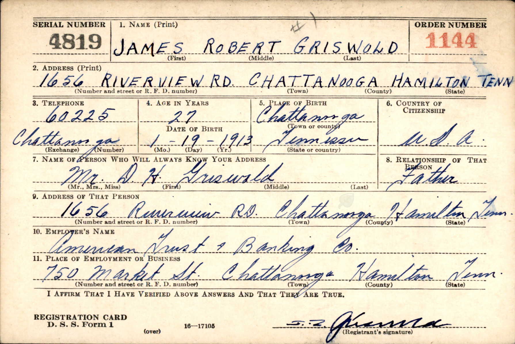 Lt. James R. Griswold of the navy, husband of Mrs. James R. Griswold and father of James Jr. of the Fort Woods Apartments, was reported killed in action in the Pacific on an undisclosed date. He is the son of D.H. Griswold, 1656 Riverview Road, president of the American Trust and Banking Company. Lt. Griswold was assistant trust Officer of the American Trust and Banking Company before he was given a leave of absence from the bank to enter the navy in 1942. A graduate of Phillips Andover School and of Yale University, he entered the navy as a lieutenant, junior grade, and later was promoted to the rank of full lieutenant. Lt. Griswold was prominent in business and social life of Chattanooga. He was a member of the Mountain City Club and the Chattanooga Gold and Country Club. He trained at Quonset Point, R.I., and attended radar school at Pearl Harbor. He was assigned to sea duty in 1943 and was on sea duty until he was killed. He was buried at sea with full military honors. He is survived by his wife and son; his father; one sister, Mrs. J.P. Rickman; one brother, Dillard Griswold; his aunt, Miss Dura Griswold and his grandmother, Mrs. E.N. Griswold.