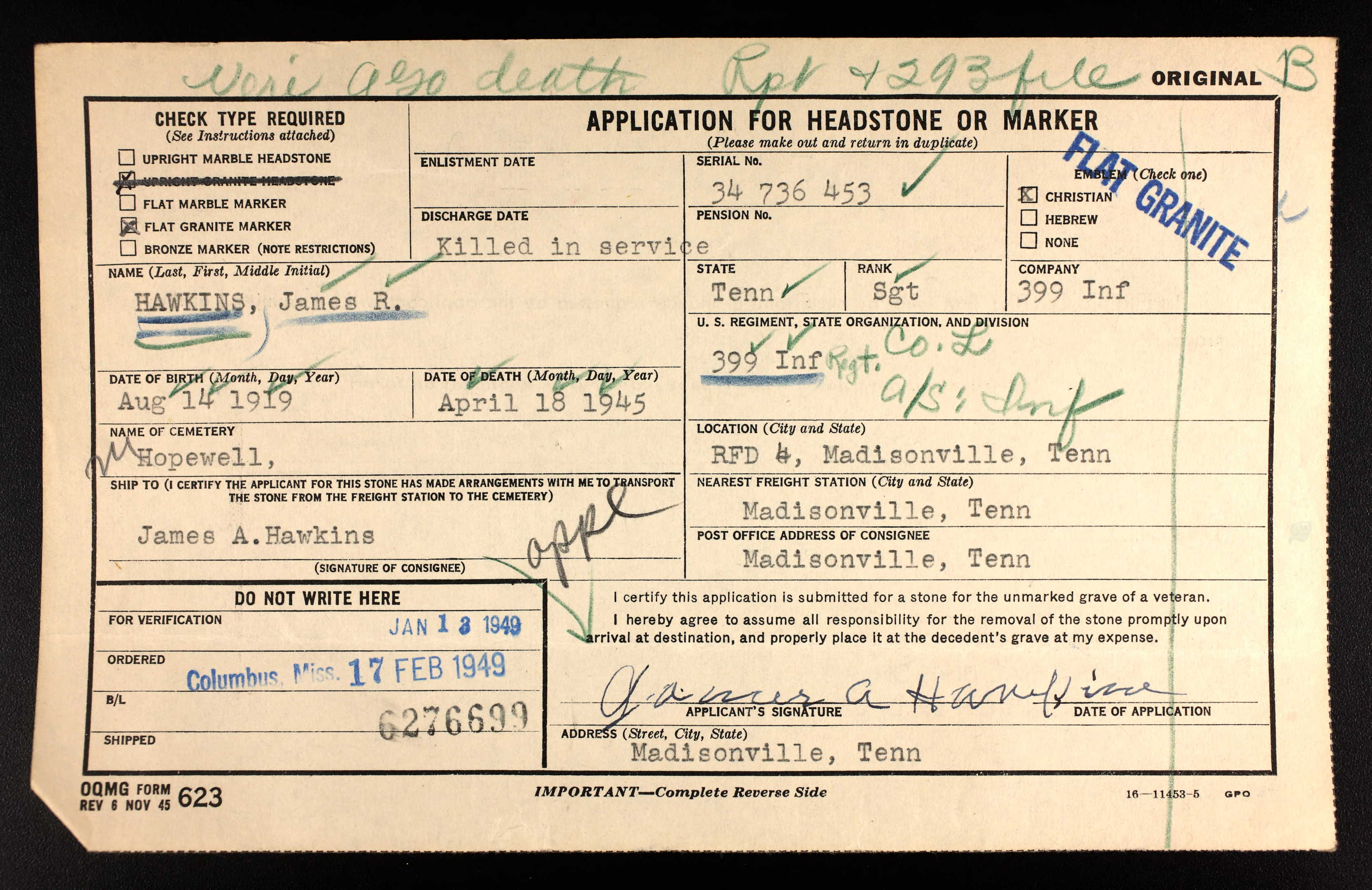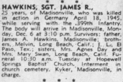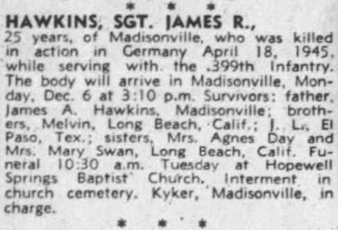 The body of Sgt. James R. Hawkins, age 25, who was killed in action in Germany on April 18, 1945, while serving with the 399th Inf. arrived in Madisonville on Monday, Dec. 6 at 310 o’clock p.m. Funeral services were held at Hopewell Springs Baptist Church with burial in the cemetery nearby. Kyker in charge.