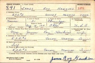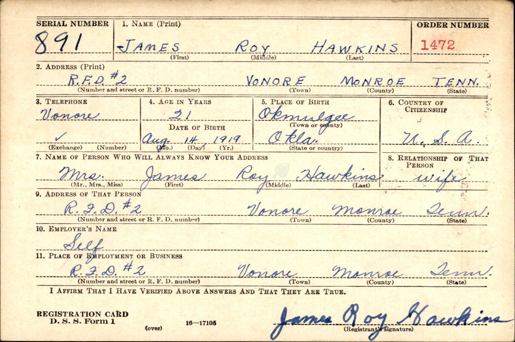 James Roy Hawkins was born in Okmulgee, Oklahoma, the son of James A. Hawkins and Elizabeth “Eliza” White. He married Reba Watson in 1940.