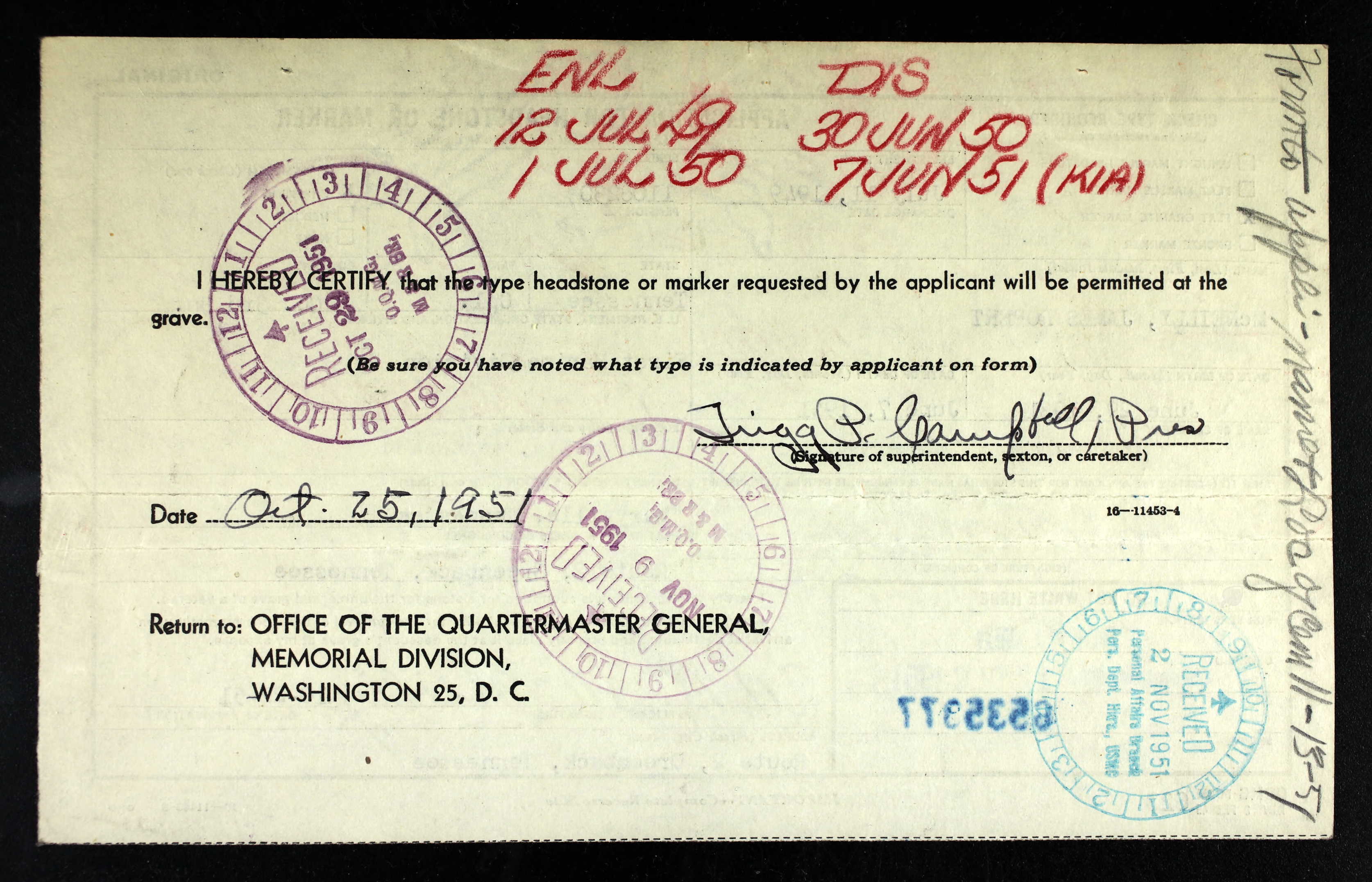 - Awards: Purple Heart, Combat Action Ribbon, Korean Service Medal, United Nations Service Medal, National Defense Service Medal, Korean Presidential Unit Citation, and Republic of Korea War Service Medal