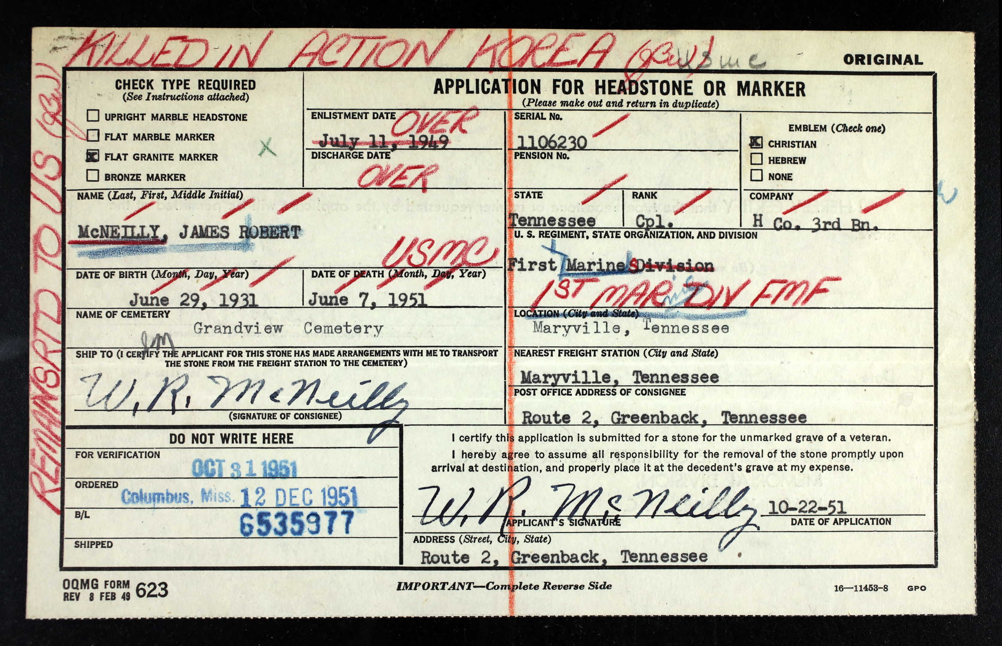 Corporal James Robert McNeilly was born in Greenback, Tennessee, on June 29, 1931. He was a member of Company H, 3rd Battalion, 1st Marines, 1st Marine Division. He was Killed in Action while fighting the enemy in the Punch Bowl Area of Korea during Operation Piledriver on June 7, 1951. His death is listed as a hostile casualty caused by an explosive device.