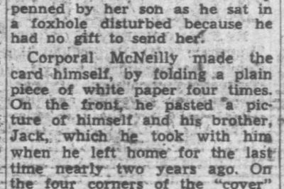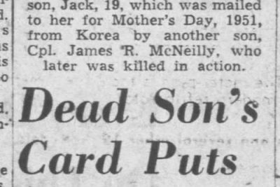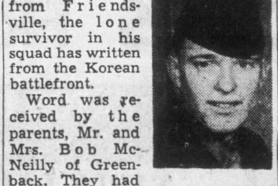 An artillery Shell bursting in the trees under which he was taking cover cost the life of Cpl. James R. (Jimmy) McNeilly, young Marine reservist from Friendsville, the lone survivor in his squad has written from the Korean Battlefront. Word was received by the parents, Mr. and Mrs. Bob McNeilly of Greenback. They had been officially notified of their son’s death last June, but learned only through the buddy’s letter that death was received from an artillery tree burst. Jimmy was graduated from Friendsville High School in 1949. He was called back to active duty in October, 1950, after one year in the service. He has two brothers, Jackie, 18, and Johnnie Max, 11, and a sister, Dorothy Jean, 15. He was engaged to be married to Miss Barbara Hunt, also a graduate of Friendsville High School.