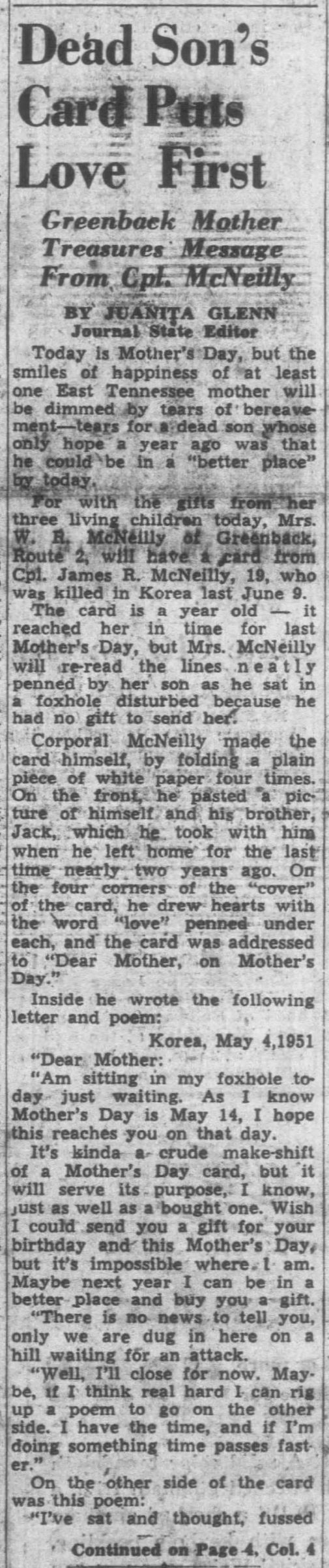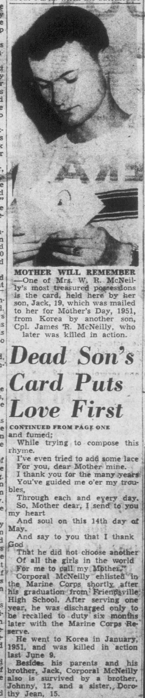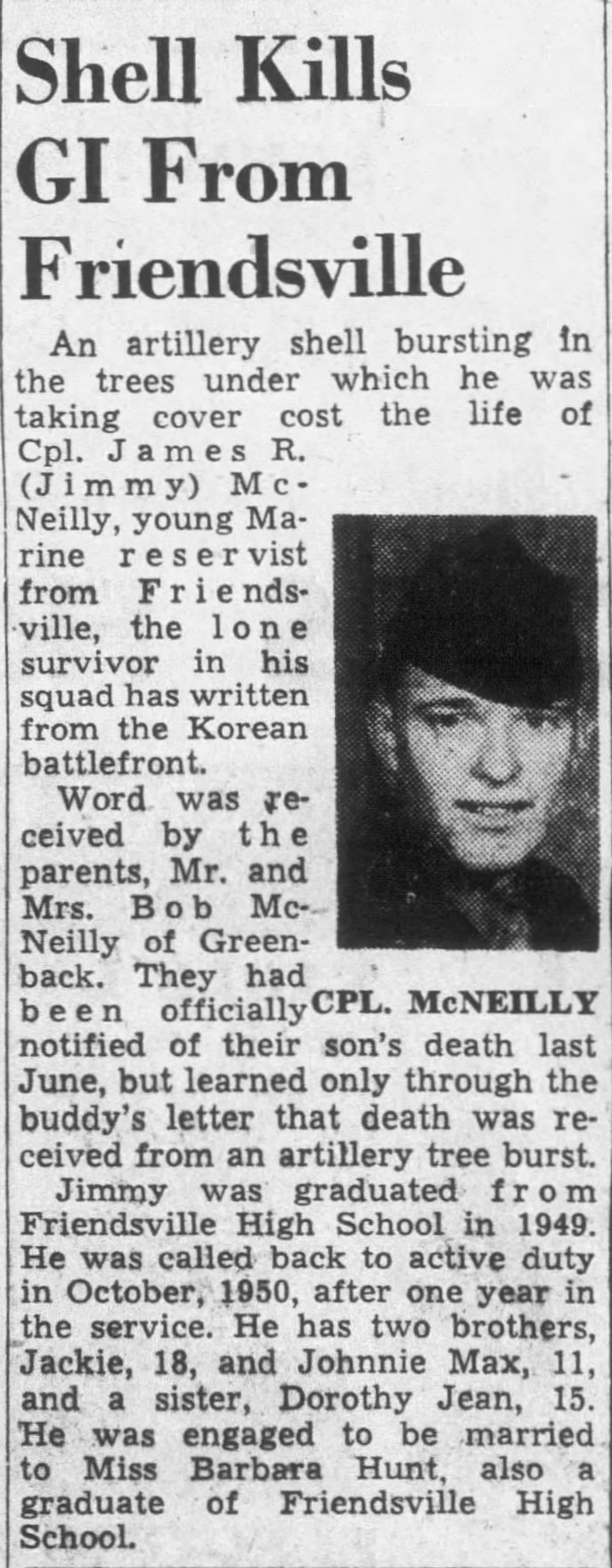 An artillery Shell bursting in the trees under which he was taking cover cost the life of Cpl. James R. (Jimmy) McNeilly, young Marine reservist from Friendsville, the lone survivor in his squad has written from the Korean Battlefront. Word was received by the parents, Mr. and Mrs. Bob McNeilly of Greenback. They had been officially notified of their son’s death last June, but learned only through the buddy’s letter that death was received from an artillery tree burst. Jimmy was graduated from Friendsville High School in 1949. He was called back to active duty in October, 1950, after one year in the service. He has two brothers, Jackie, 18, and Johnnie Max, 11, and a sister, Dorothy Jean, 15. He was engaged to be married to Miss Barbara Hunt, also a graduate of Friendsville High School.