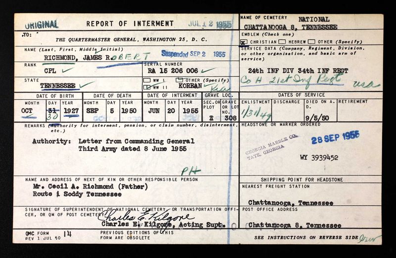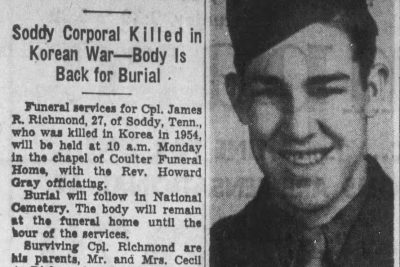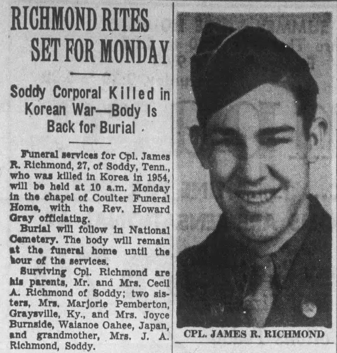 Funeral services for Cpl. James R. Richmond, 27, of Soddy, Tenn., who was killed in Korea in 1950, will be held in the chapel of Coulter Funeral Home. Burial will follow in National Cemetery. The body will remain at the funeral home until the hour of the service. Surviving Cpl. Richmond are his parents, Mr. and Mrs. Cecil A. Richmond of Soddy; two sister, Mrs. Marjorie Pemberton, Graysville, Ky., and Mrs. Joyce Burnside, Waianoe Oahee, Japan, and grandmother, Mrs. J.A. Richmond, Soddy.