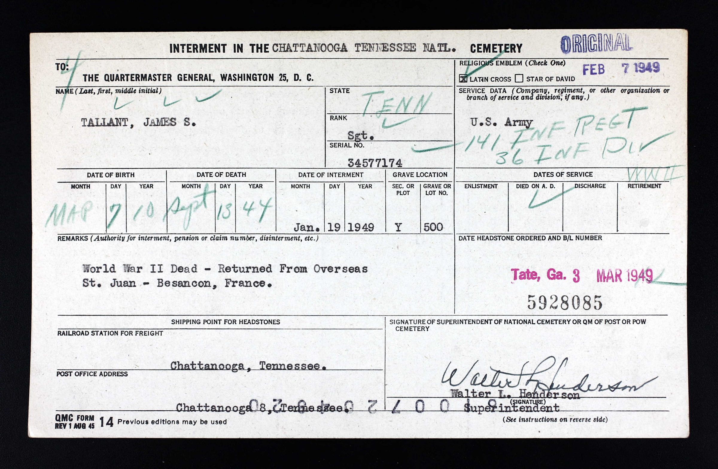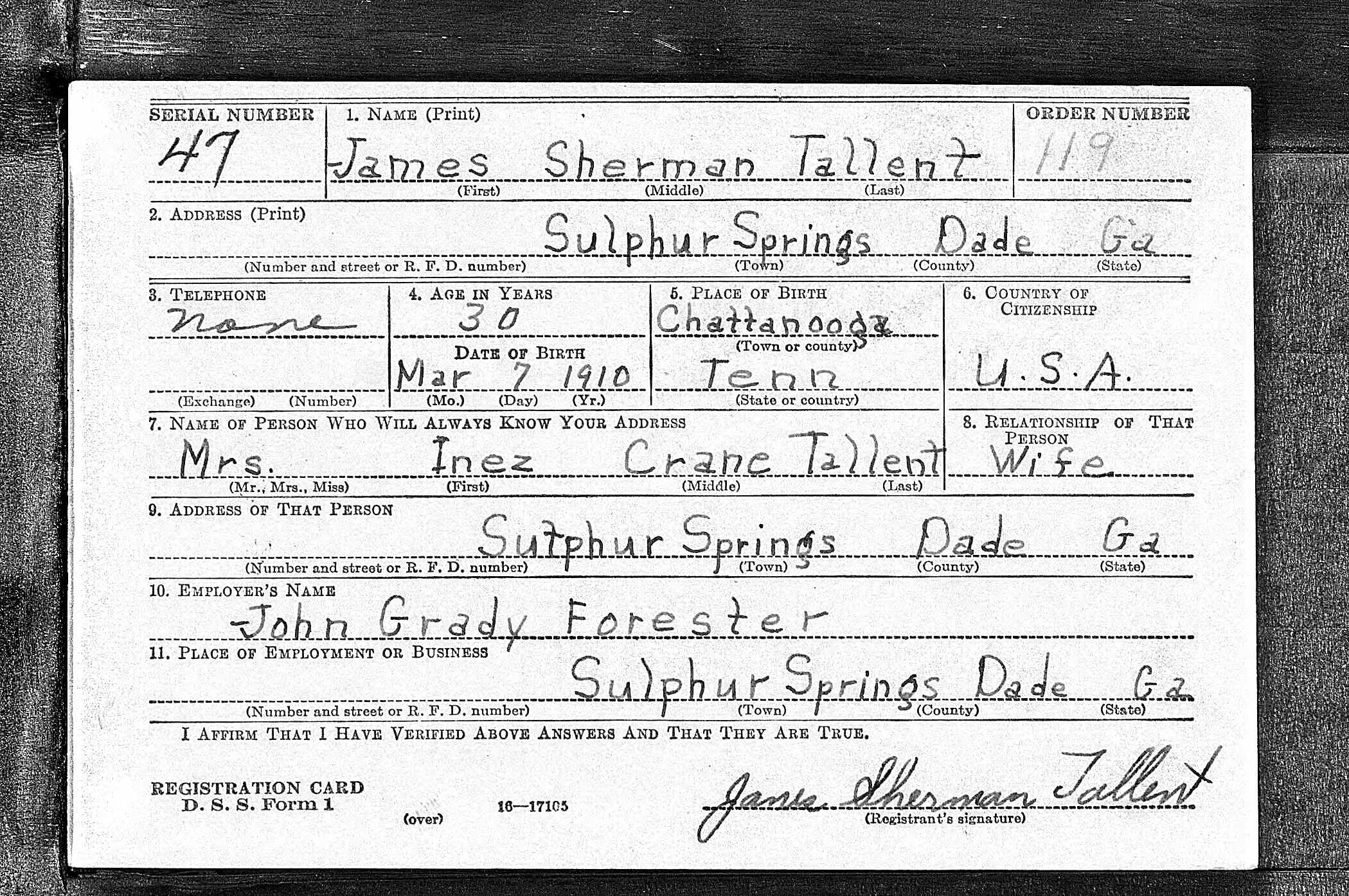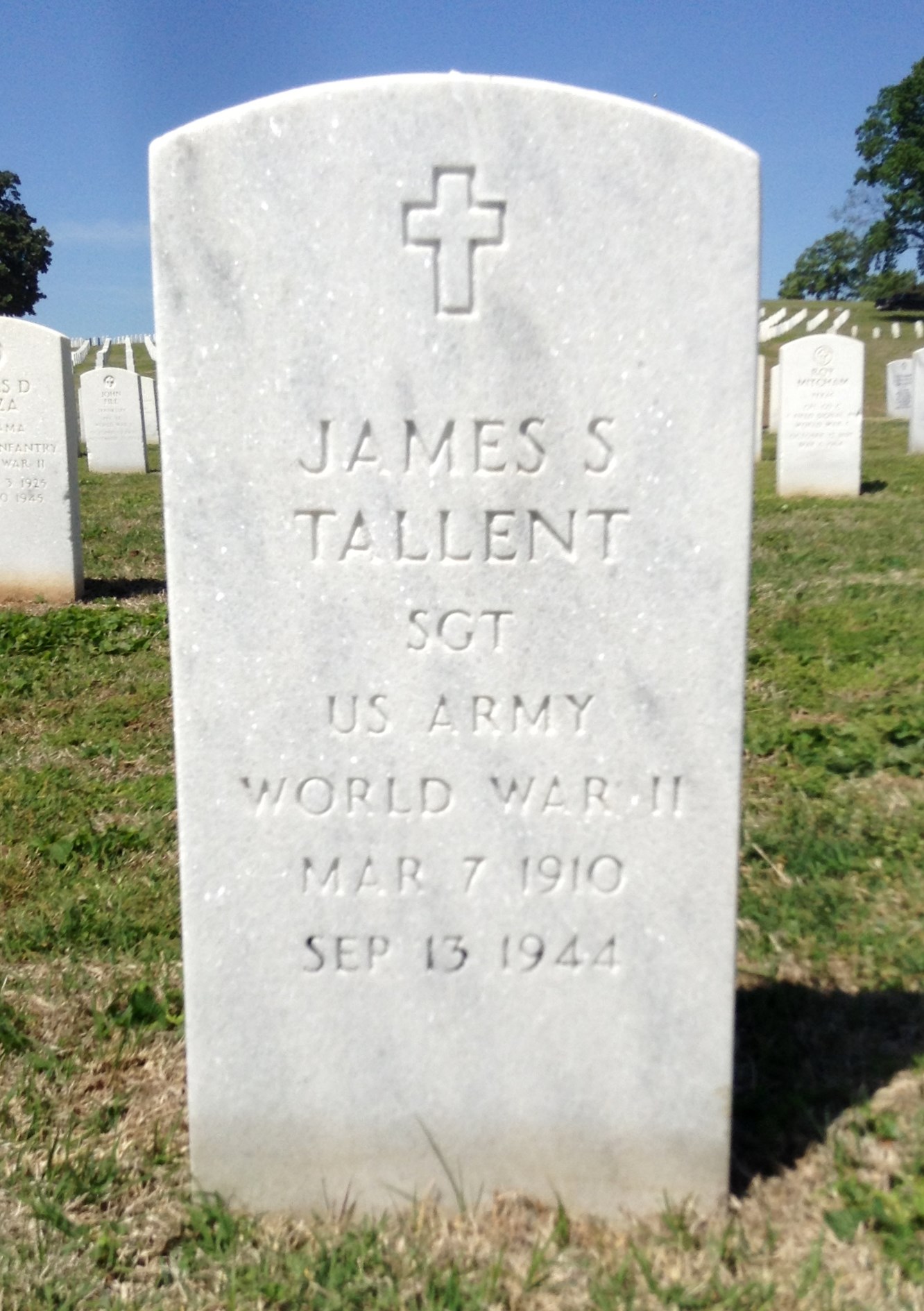 James Sherman Tallent was the son of Perry William Tallent and Annie Bell Hyde. He married Inez Crane in 1930 and was the father of Billy John Tallent, Bobbie Nell Tallent and Barbara Tallent. He and his family resided in Sulphur Springs in Georgia at the time of his enlistment. He enlisted 8 December 1942 at Fort McPherson Atlanta, Georgia.