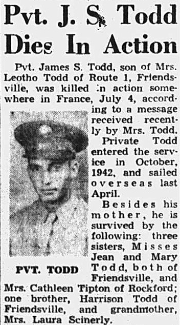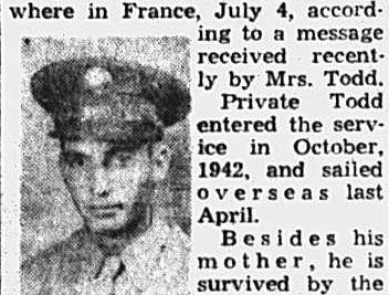 Pvt. James S. Todd was killed in action somewhere in France, July 4. Private Todd entered the service in October, 1942 and sailed overseas last April.