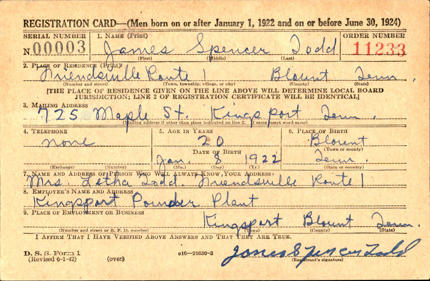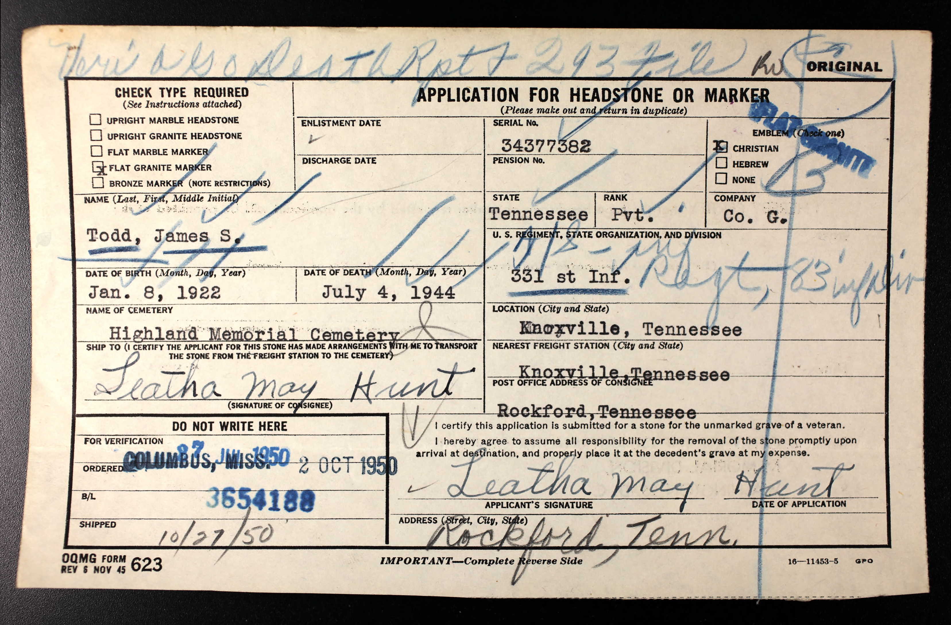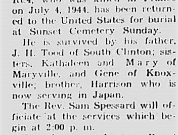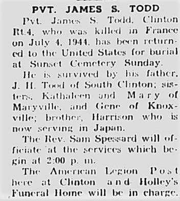 Pvt. James S. Todd, Clinton, Rt.4, who was killed in France on July 4, 1944, has been returned to the United States for burial at Sunset Cemetery Sunday. He is survived by his father, J.H. Todd of South Clinton; sisters, Kathaleen and Mary of Maryville, and Gene of Knoxville; brother, Harrison who is now serving in Japan.