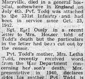 Sgt Earl Ously in a recent letter to Mrs. Houser told of Todd’s death but the particulars in the letter had been cut out by the censor.