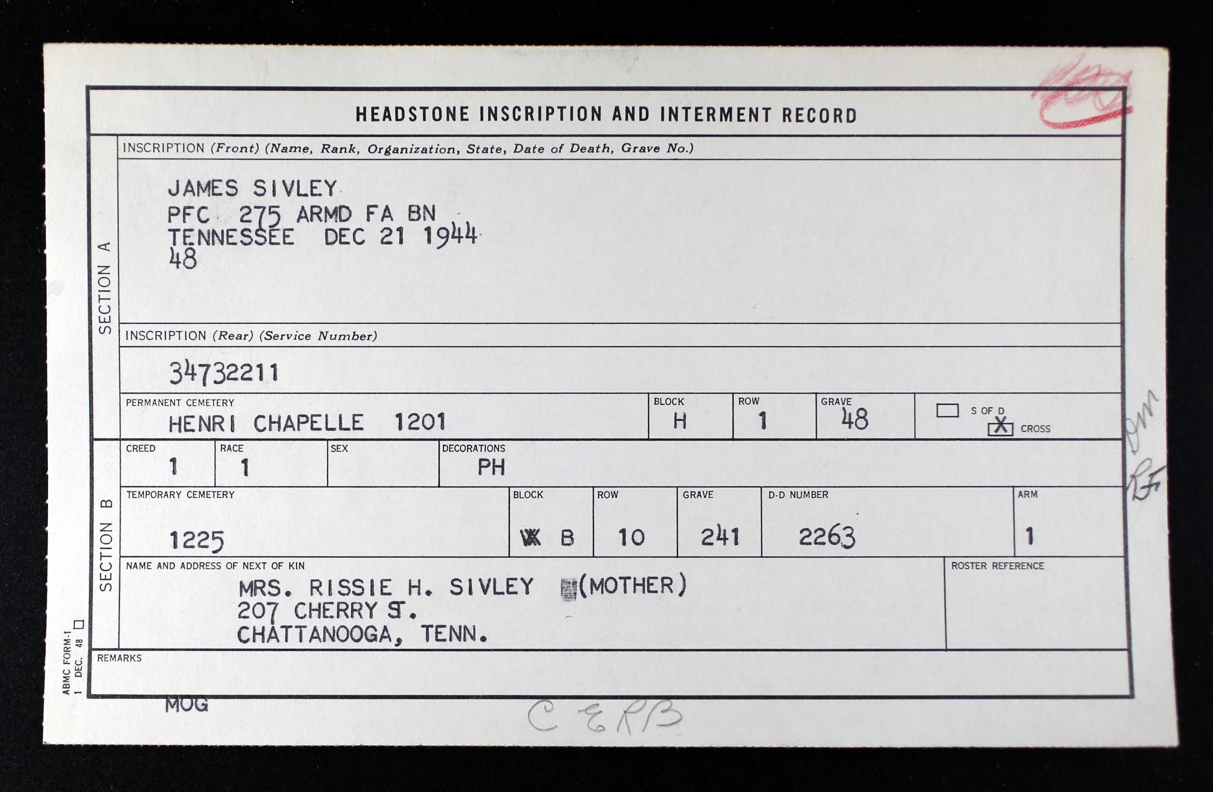 Pfc. James Sivley, son of Mrs. Rissie H. Sivley, 207 Cherry Street, was reported killed in action in Belgium on Dec. 21. He was employed by the Ross-Meehan Foundry before entering the army in April, 1942. He has been overseas six months. He has a sister, Miss Helen Sivley and a brother Benny Sivley.