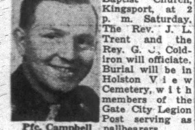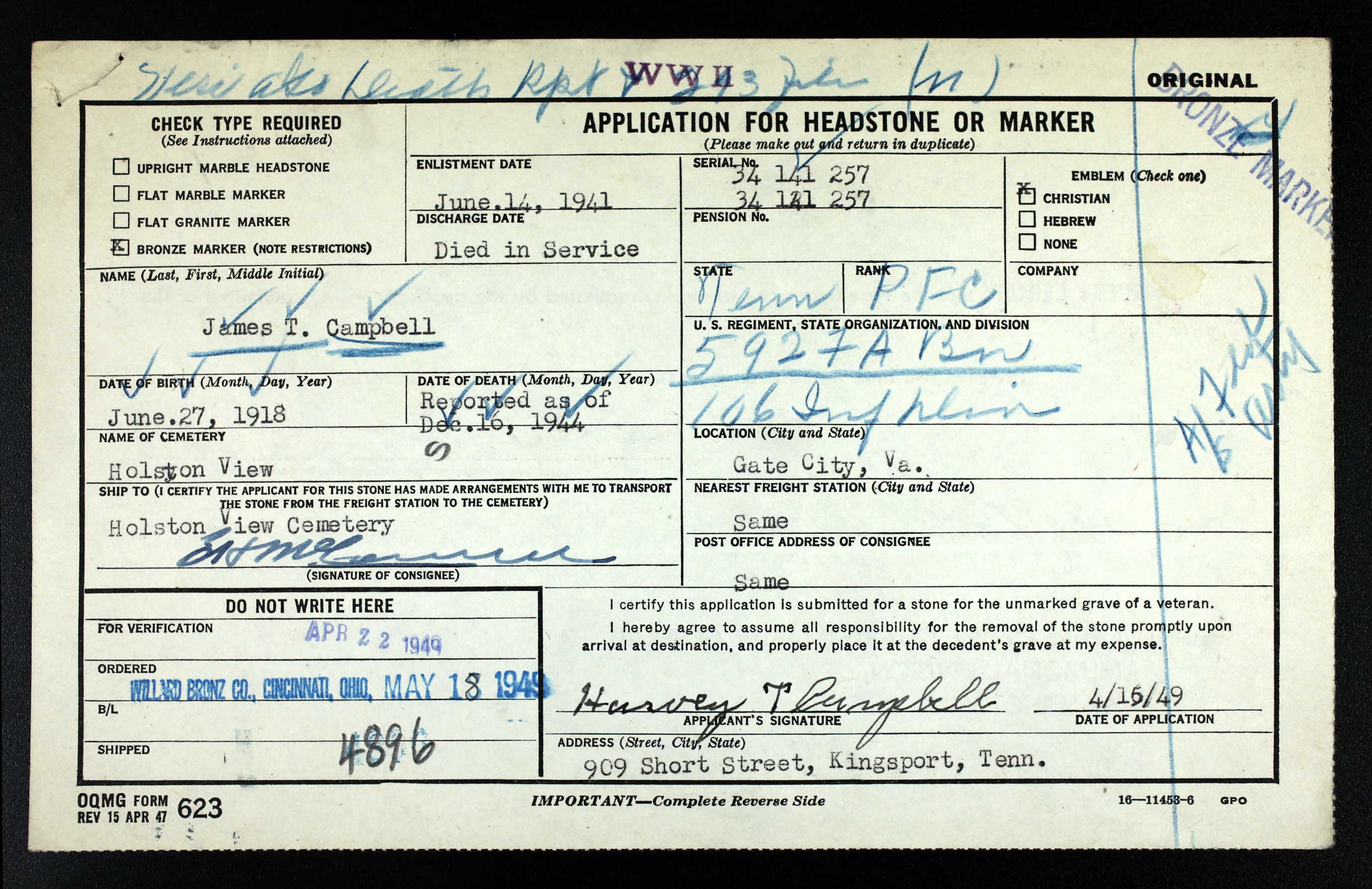 Pfc. Campbell entered the service June 14, 1941. He completed his basic training at Fort Sill, OK, and was awarded the Good Conduct Medal and the Certificate of Honor. He later trained at Camp Atterbury, IN, and went overseas in November 1944. He was Killed in Action in Aachen, Germany December 16, 1944 during the Battle of the Bulge.