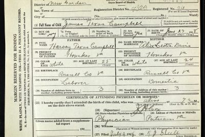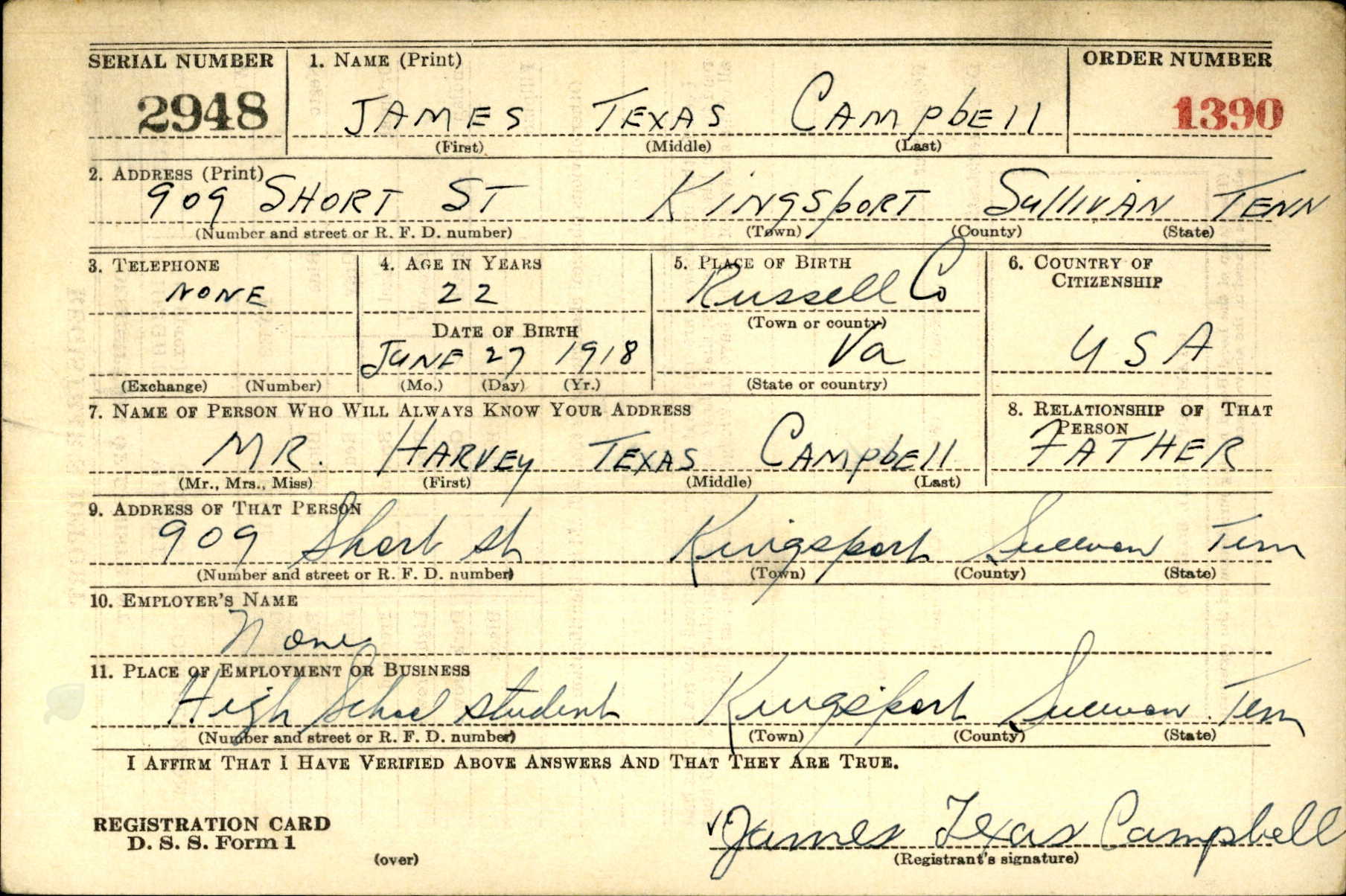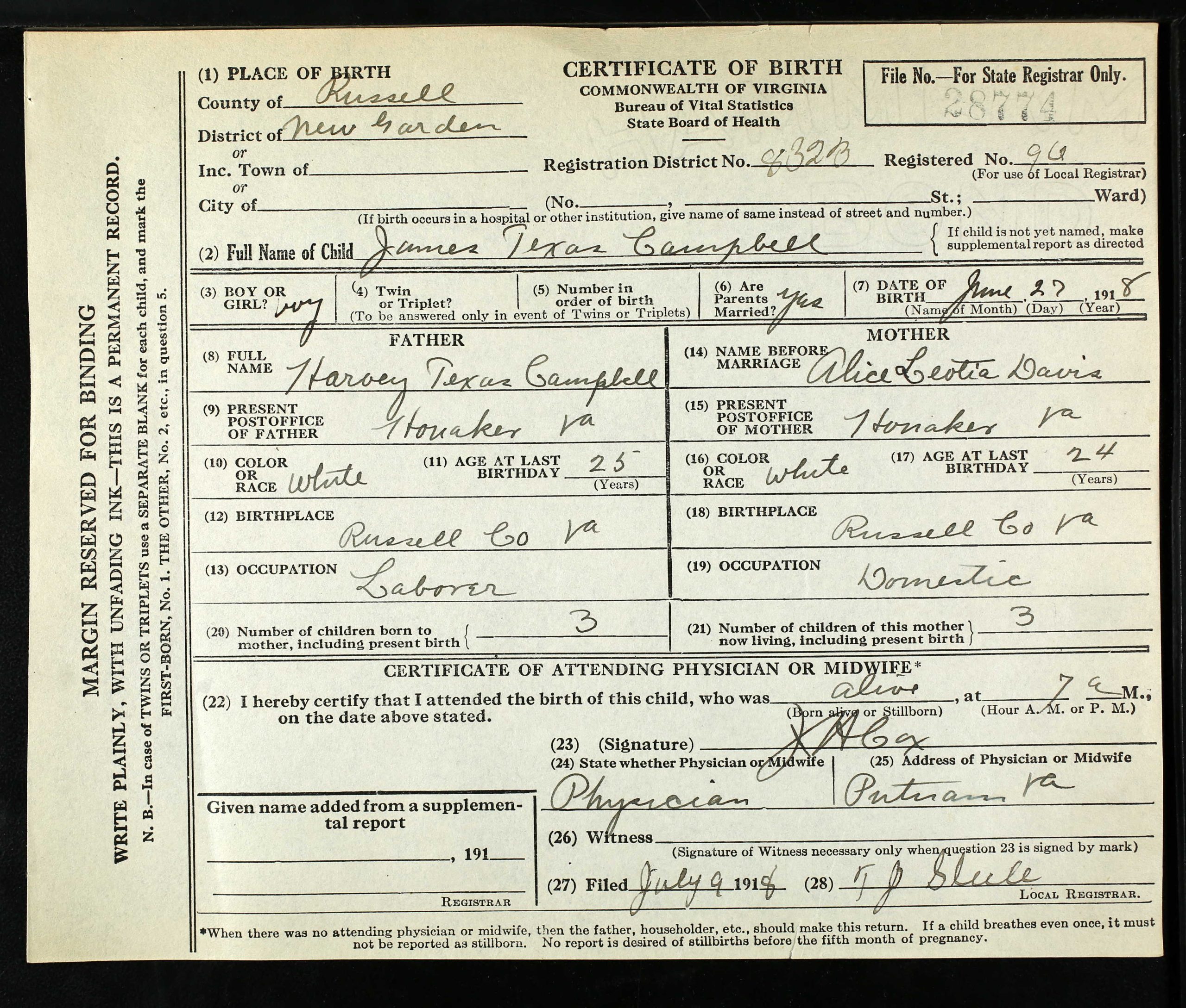 James Texas Campbell was born in Russell County, Virginia. He was the son of Harvey Texas Campbell and Alice Leotia Davis.