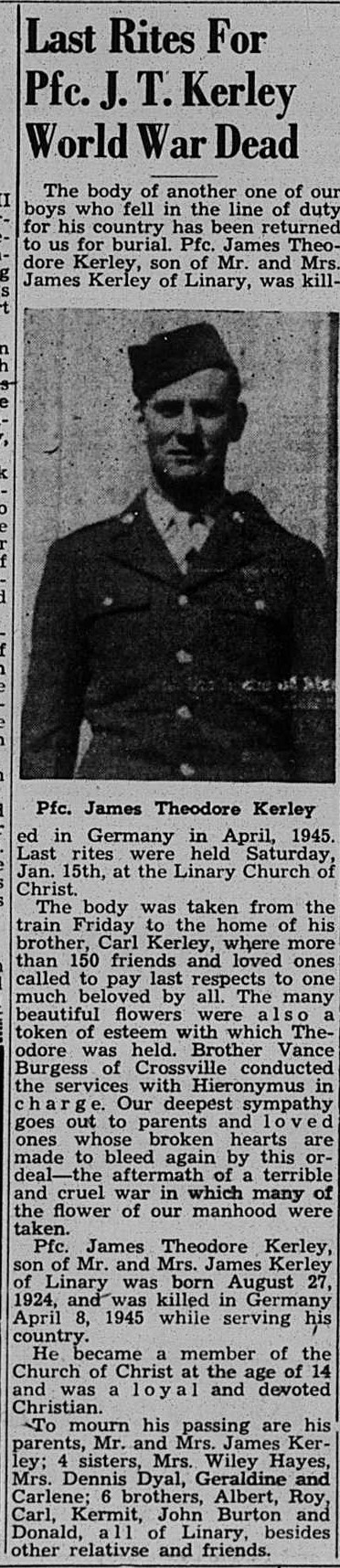 The body of another one of our boys who fell in the line of duty for his country has been returned to us for burial. Pfc. James Theodore Kerley, son of Mr. and Mrs. James Kerley of Linary, was killed in Germany in April, 1945. The body was taken from the train Friday to the home of his brother, Carl Kerley, where more than 150 friends and loved ones called to pay last respects to one much beloved by all. The many beautiful floers were also a token of esteem with which Theodore was held. Brother Vance Burgess of Crossville conducted the services with Hieronymus in charge. Our deepest sympathy goed out to parents and loved ones whose broken hearts are made to bleed again by this ordeal – the aftermath of a terrible and cruel was in which many of the flower of our manhood were taken. Pfc. James Theodore Kerley, son of Mr. and Mrs. James Kerley of Linary was born August 27, 1924, and was killed in Germany April 8, 1945 while serving this country. He became a member of the Church of Christ at the age of 14 and was a loyal and devoted Christian.