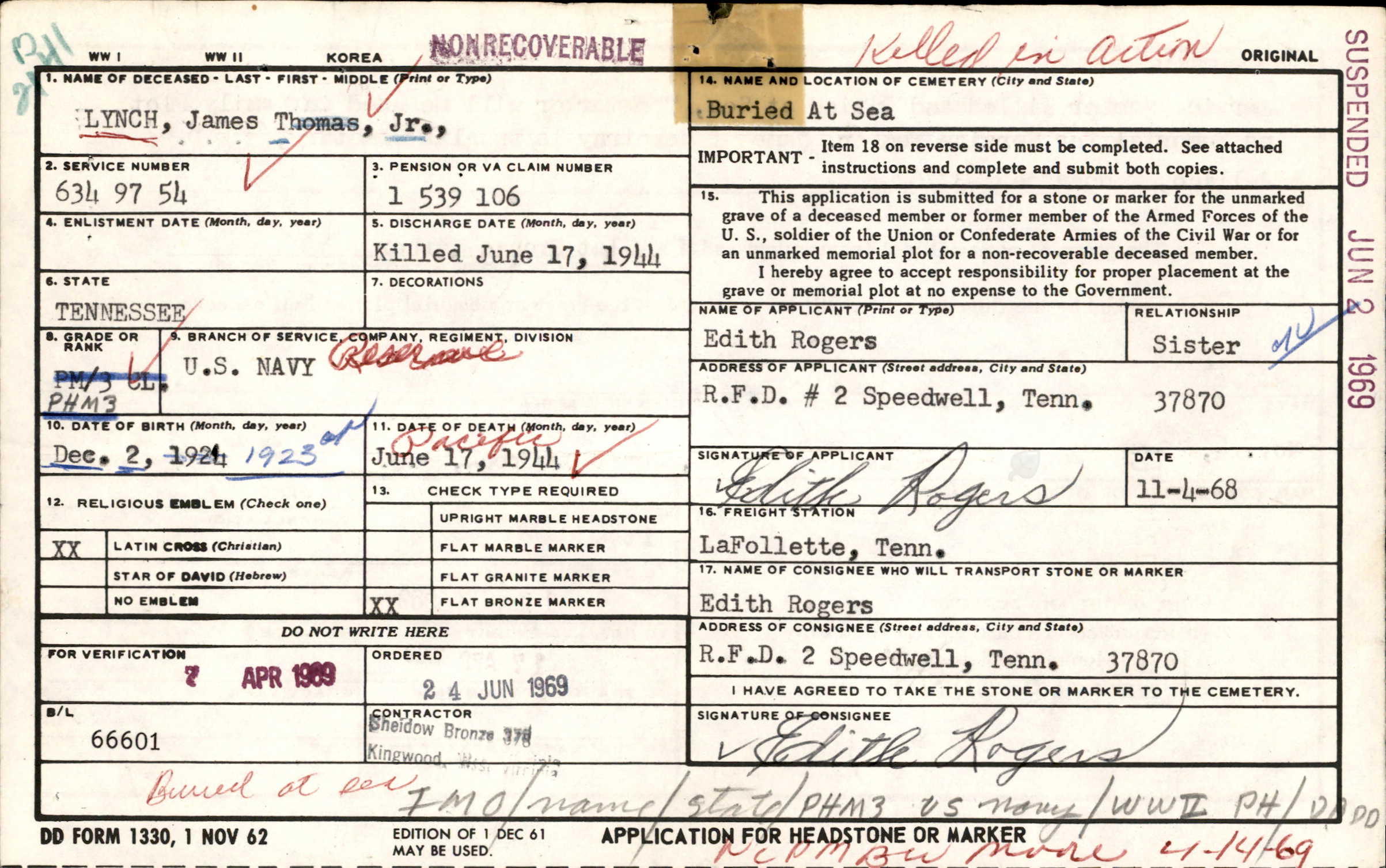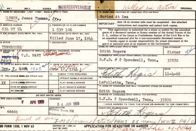 He was buried at sea and his name memorialized at the Tablets of the Missing Memorial in Honolulu, Hawaii and Douglas Cemetery No. 1, Oswego, Campbell County, Tennessee.
