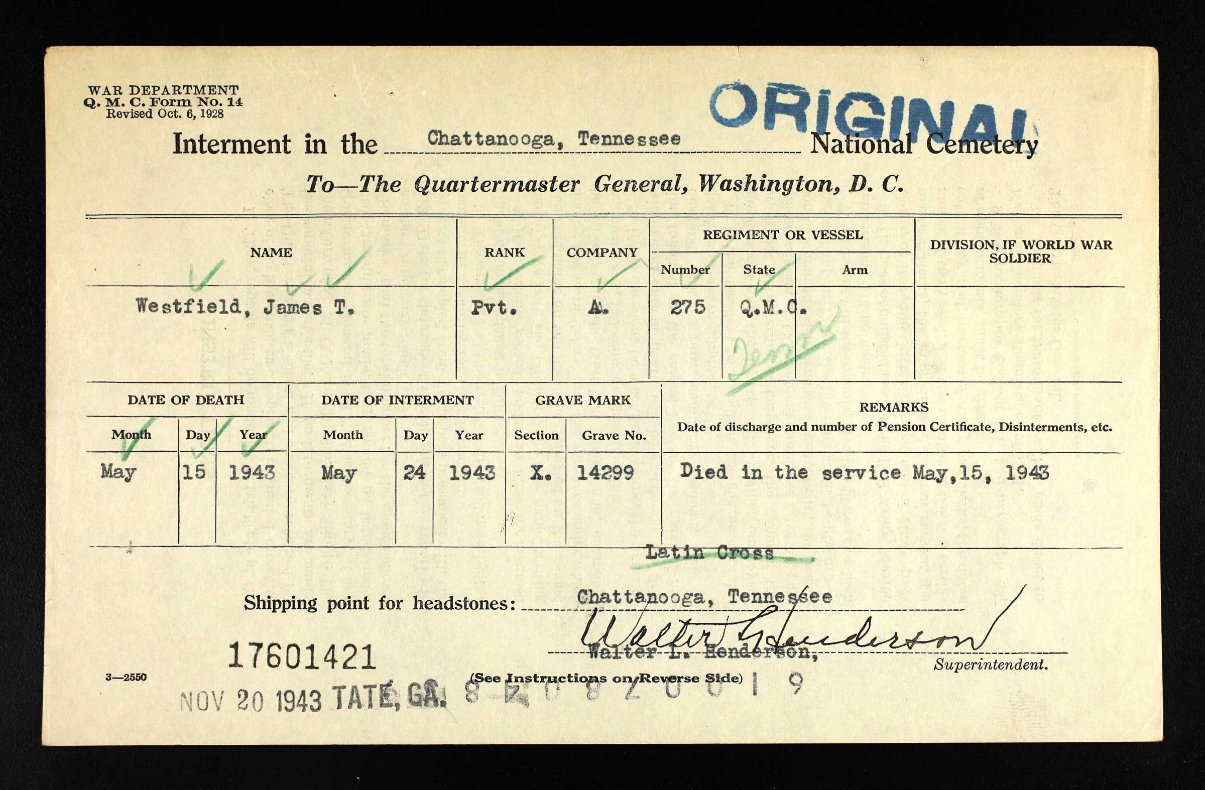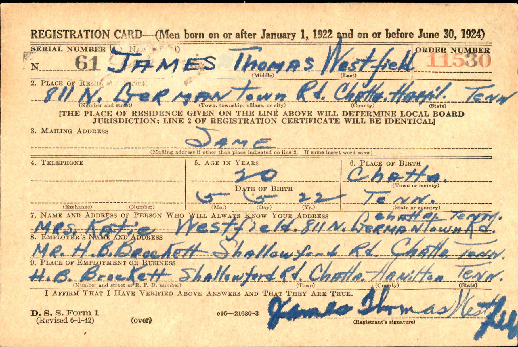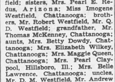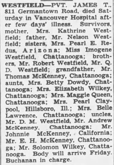 Pvt. James T. Westfield, 811 Germantown Road, died Saturday in Vancouver Hospital after few days’ illness. Survivors, mother, Mrs. Kathrine Westfield; father, Mr. Nelson Westfield; sisters, Mrs. Pearl E. Redus, Arizona; Miss Imogene Westfield, Chattanooga; brothers, Mr. Robert Westfield, Mrs. Q.D. Westfield; granfather, Mr. Thomas McKenney, Chattanooga and several aunts and uncles.