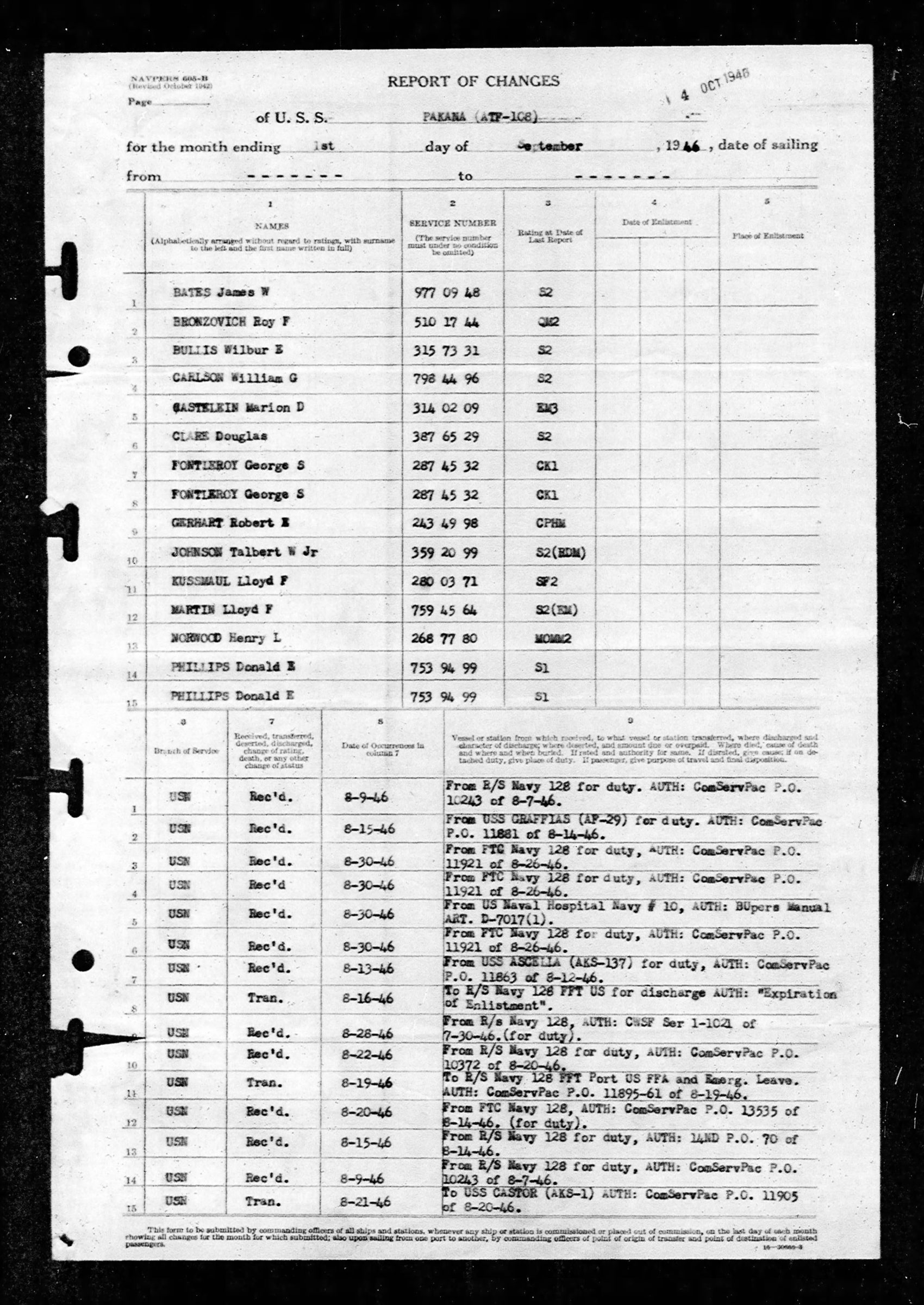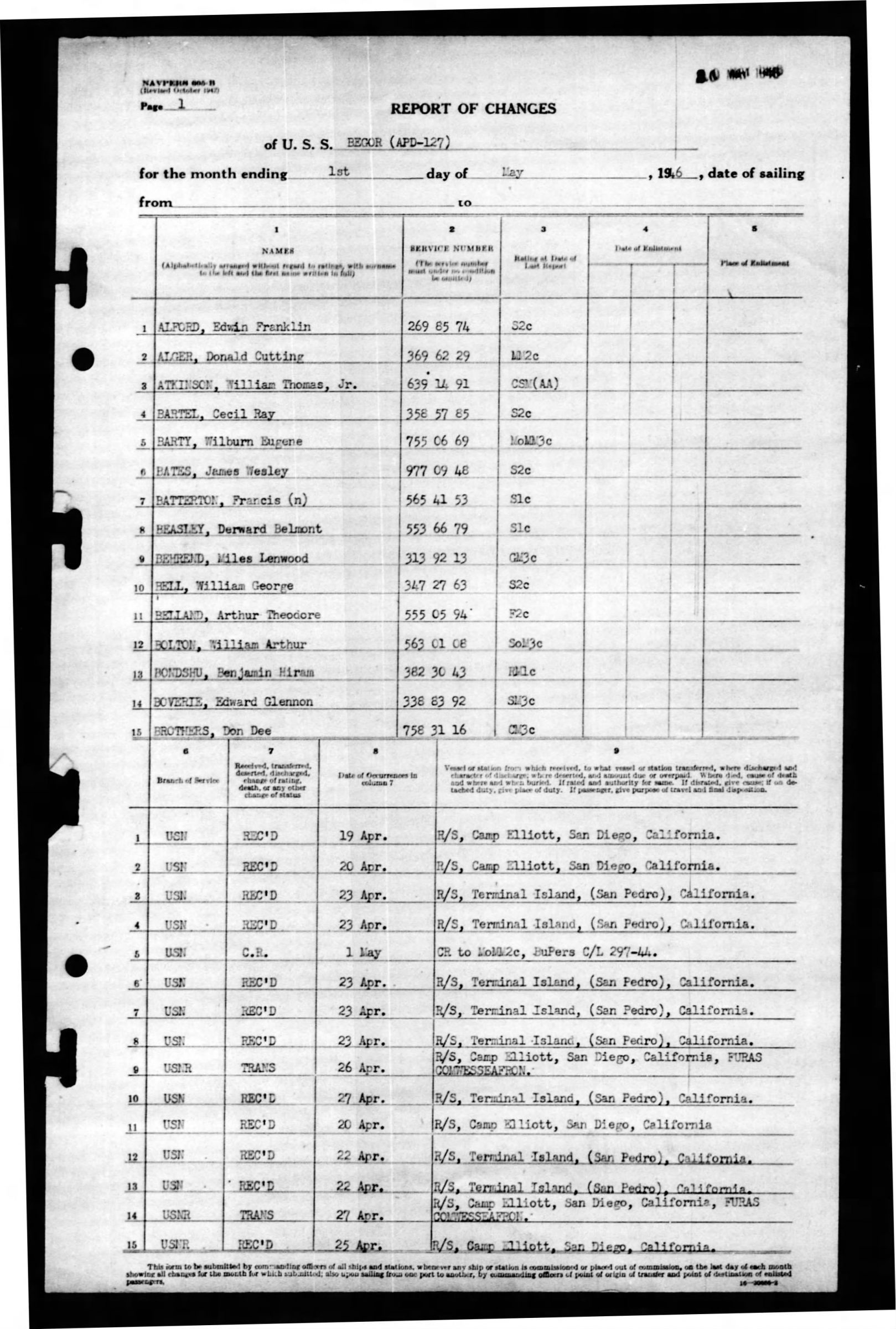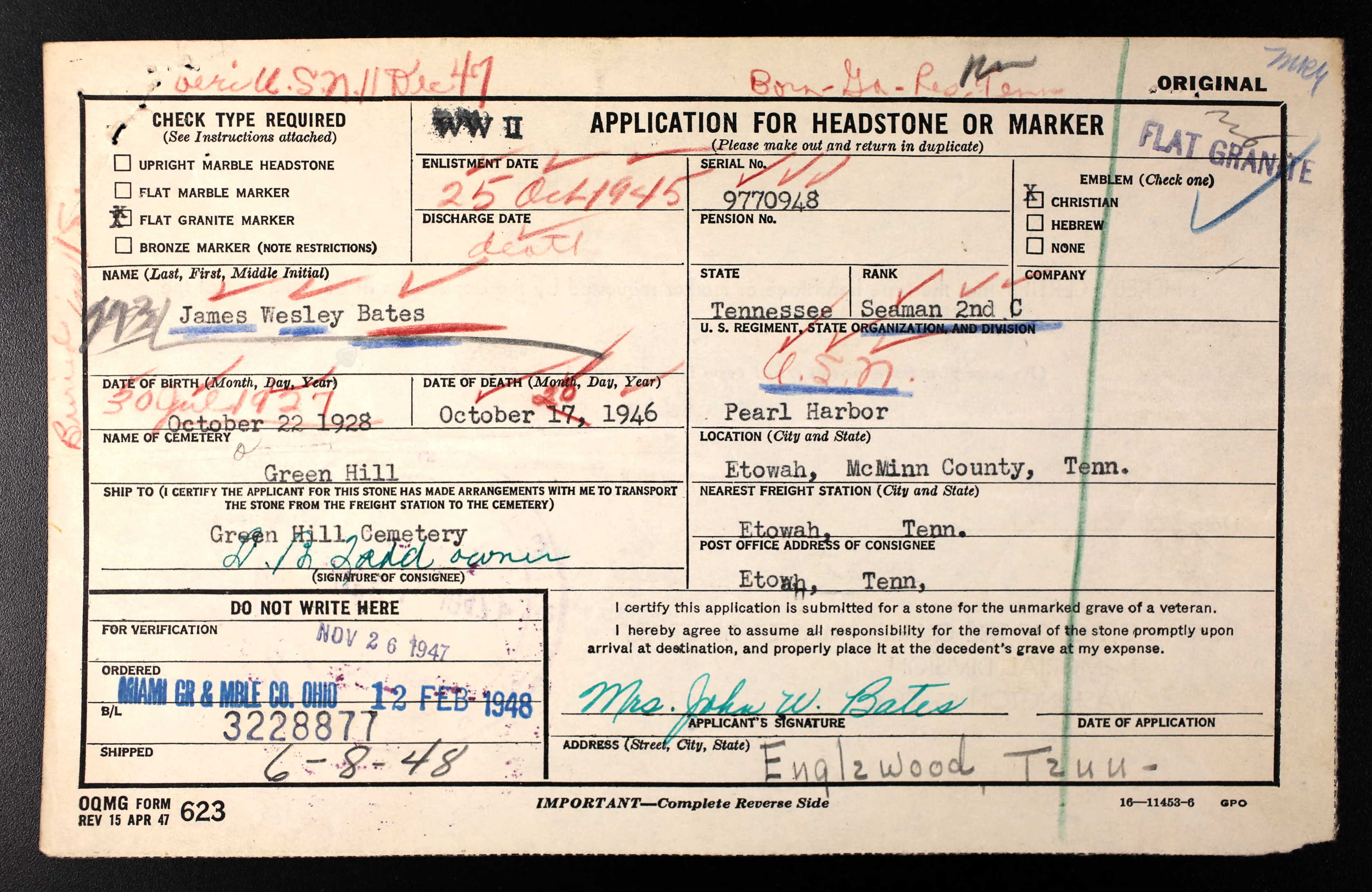 James Wesley Bates served on the U.S.S. Begor (APD-127) and the U.S.S. Pakana (ATF-108). He drowned in Pearl Harbor.