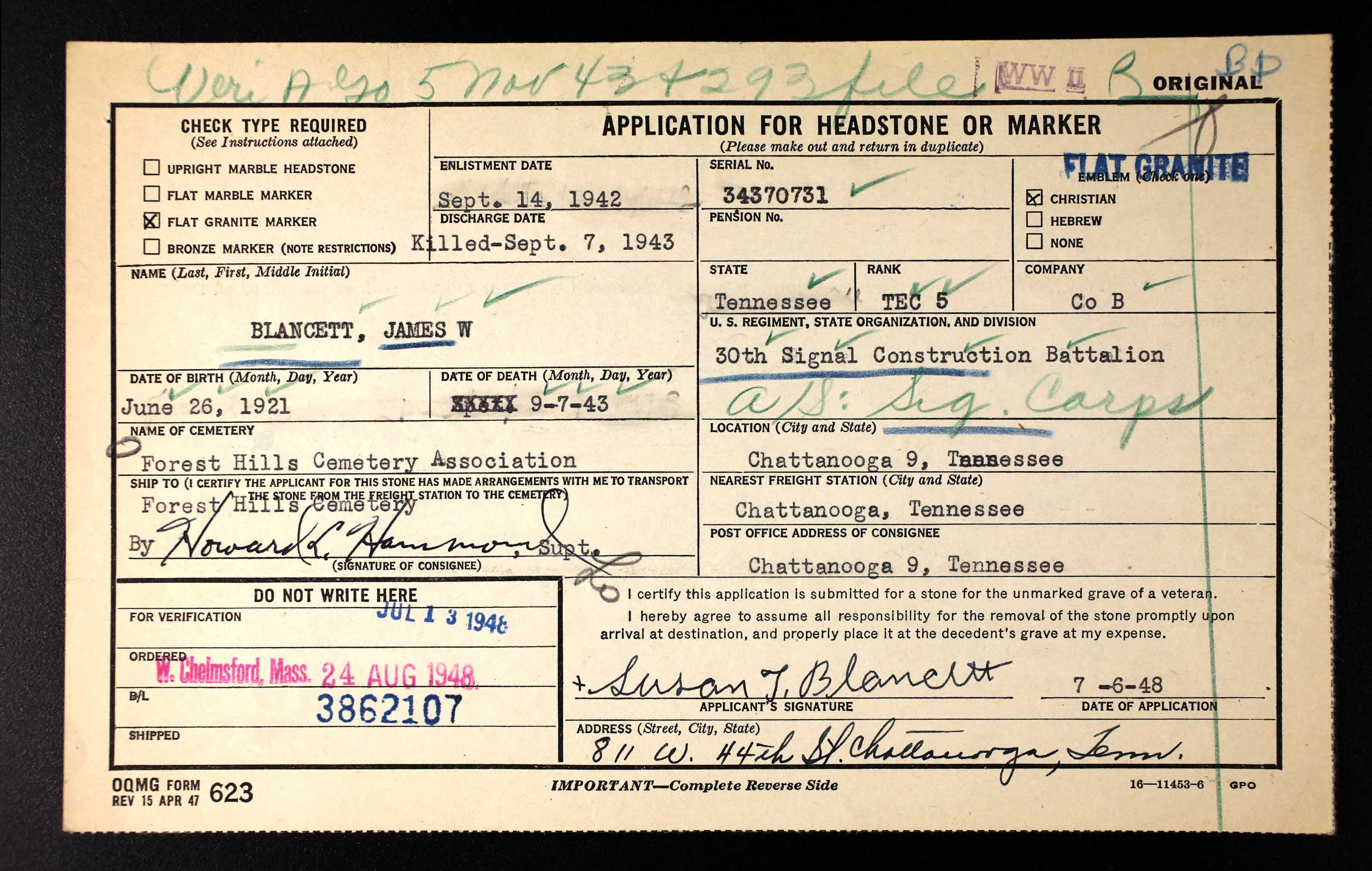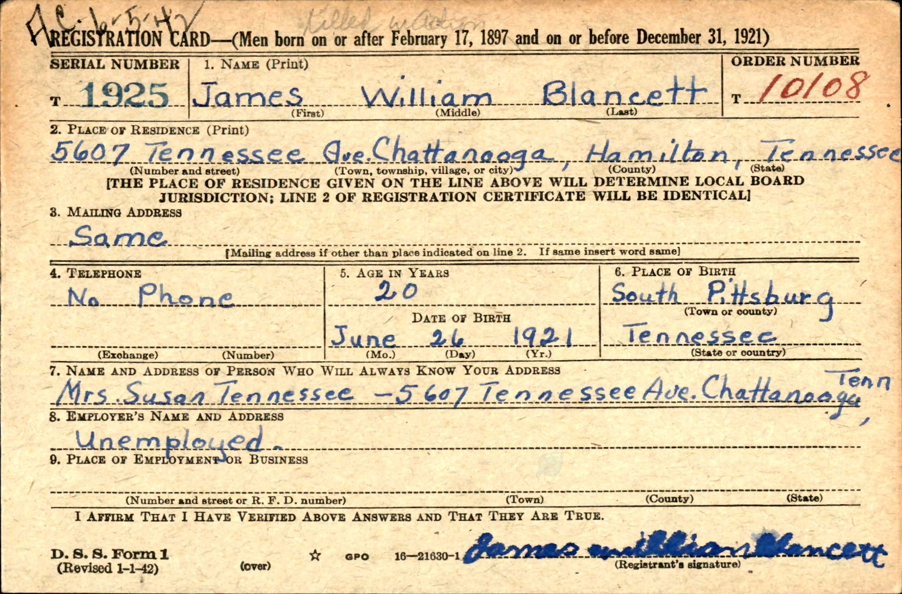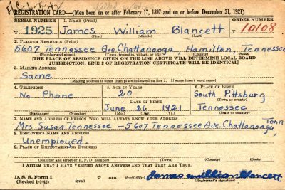 James William Blancett was born on 26 June 1921 at South Pittsburg, Tennessee, the son of Benjamin Franklin Blancett and Susan Tennessee “Tenny” Badger.