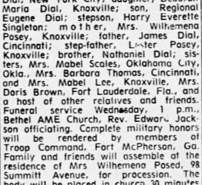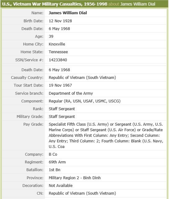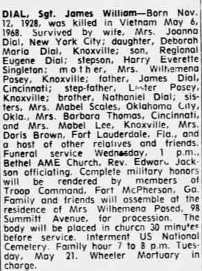 Sgt. James W. Dial, who was to have retired next February after 22 years with the Army, was killed on May 6 in Vietnam, his family here has learned. Sgt. Dial. 38, son of Mrs. Wilhelmena Dial Posey, 98 Summitt Ave., was killed by a Communist rocket during a battle in a jungle, according to a telegram Mrs. Posey received. He had been in Vietnam since November. He had served in Korea during the conflict there and in Germany. He was employed by S.H. Kress and Co. before entering the Army. He attended Austin High School. He was marred to Mrs. Joanna Dial, New York City, but the couple had been separated for several years. He also leaves a son, Reginald Eugene Dial; daughter, Deborah Marie Dial; both of New York City; James Dial; Cincinnati; brother, Nathaniel Dial, Knoxville; sisters, Mrs. Barbara Jean Thomas, Cincinnati; and Mrs. Mable Scales, Oklahoma City. He was the grandson of the late Mrs. Mable Minus of Knoxville. The body will be returned to Knoxville for burial. Sgt. Dial was the 39th Knox Countian to be killed in Vietnam. – The Knoxville News Sentinel, Sunday, May 16, 1968