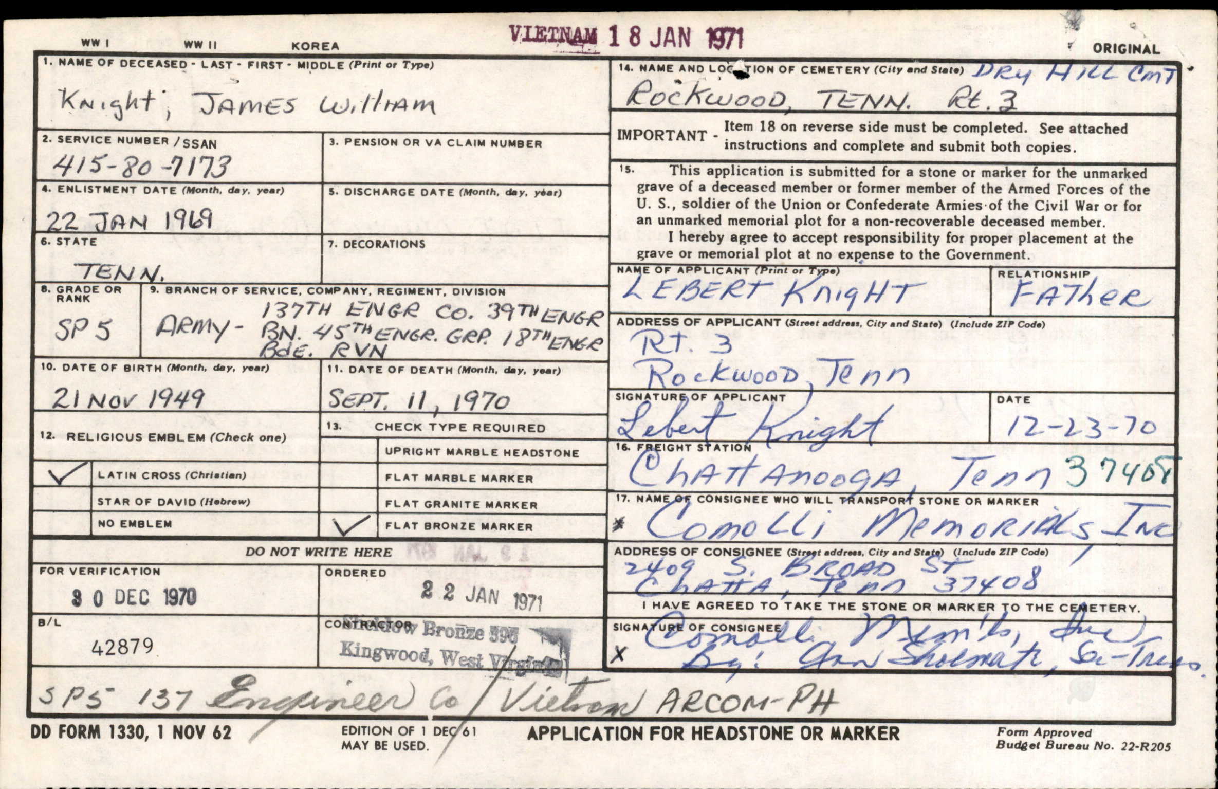 Specialist 5 James William Knight was born on November 21, 1949, and was originally from Rockwood, Tennessee. He served his country in the Vietnam War as a grader operator in 137th Engineer Company, 39th Engineer Battalion, 45th Engineer Group, 18th Engineer Brigade. His tour in Vietnam began on April 18, 1970. On September 11, 1970, SP5 Knight was killed under hostile conditions in Quang Ngai province, South Vietnam; he was 20 years old at the time of his death. SP5 Knight is buried at Dry Hill Cemetery in Roane County, Tennessee, and is memorialized on the Vietnam Veterans Memorial on Panel 7W, Line 55.