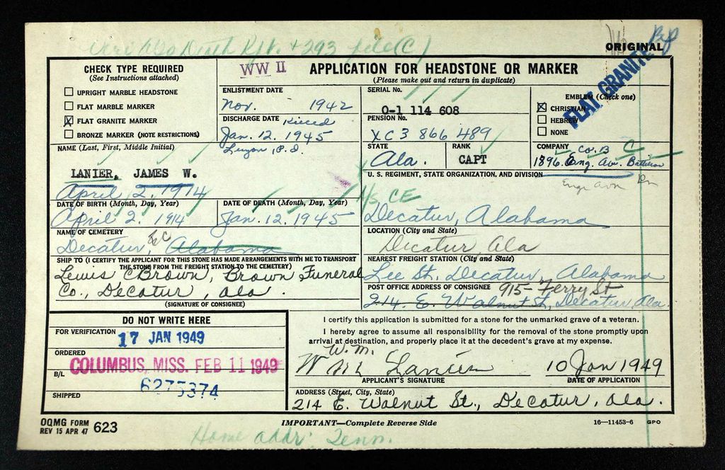 Capt. Lanier was killed in Action in Luzon 12 January 1945