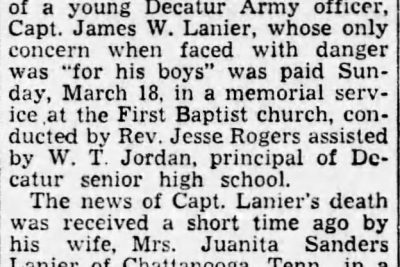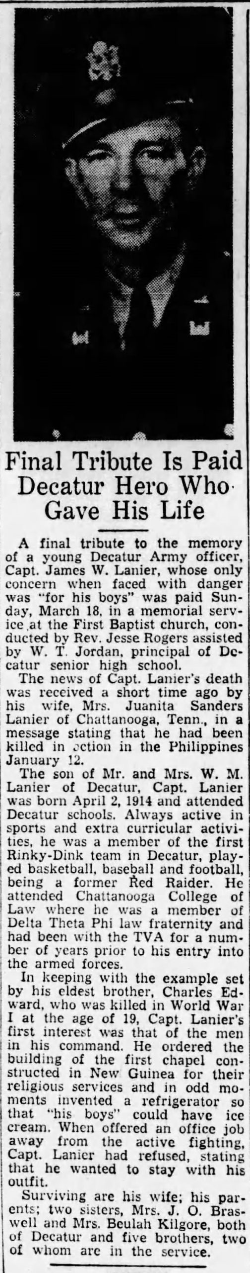 A final tribute to the memory of a young Decatur Army officer, Capt. James W. Lanier, whose only concern when face with danger “for his boys” was paid March 18, in a memorial service at the First Baptist church. The news of Capt. Lanier’s death was received a short time ago by his wife, Mrs. Juanita Sanders Lanier of Chattanooga, Tenn., in a message stated that he had been killed in action in the Philippines January 12. The son of Mr. and Mrs. W.M. Lanier of Dectur, Capt. Lanier was born April 2, 1914 and attended Decatur schools. Always active in sports and extra curricular activities, he was a member of the first Rinky-Dink team in Decatur, played basketball, baseball and football, being a former Red Raider. He attended Chattanooga College of Law where he was a member of Delta Theta Phi law fraternity and had been with the TVA for a number of years prior to his entry into the armed forces. In keeping with the example set by his eldest brother, Charles Edward, who was killed in World War I at the age of 19, Capt. Lanier’s first interest was that of the men in his command. He ordered the building of the first chapel constructed in New Guinea for their religious services and in odd moments invented a refrigerator so that “his boys” could have ice cream. When offered an office job away from the active fighting, Capt. Lanier had refused, stating that he wanted to stay with his outfit. Surviving are his wife, his parents; two sisters, Mrs. J.O. Braswell and Mrs. Beulah Kilgore, both of Decatur and five brothers, two of whom are in the service.