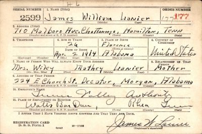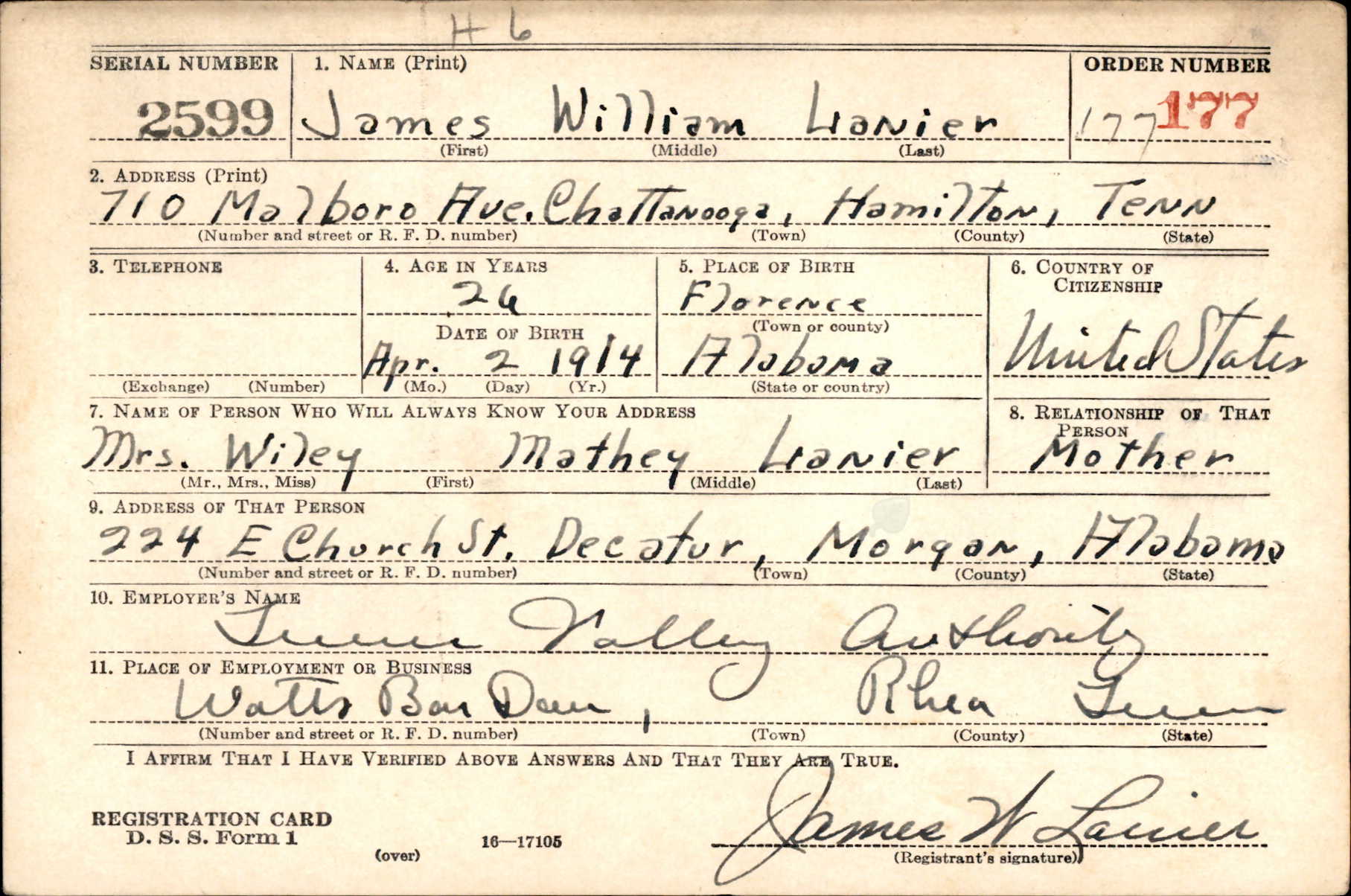 James William Lanier was born on 12 April 1914 at Florence, Alabama, the son of Matha Wiley Lanier and Neppie Till. He married Grace Juanita Sanders in 1938. James Lanier was graduated in the schools of Decatur and attended the Chattanooga College of Law, a member of the Delta Theta Phi fraternity.