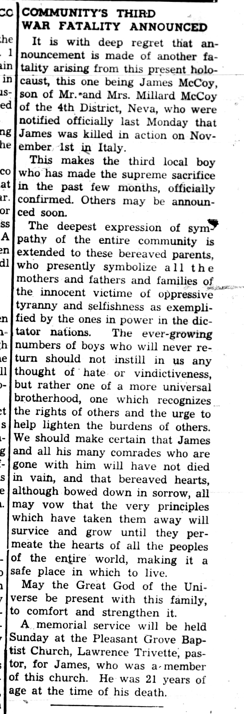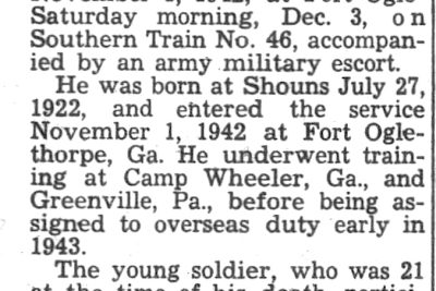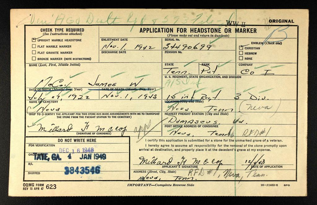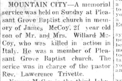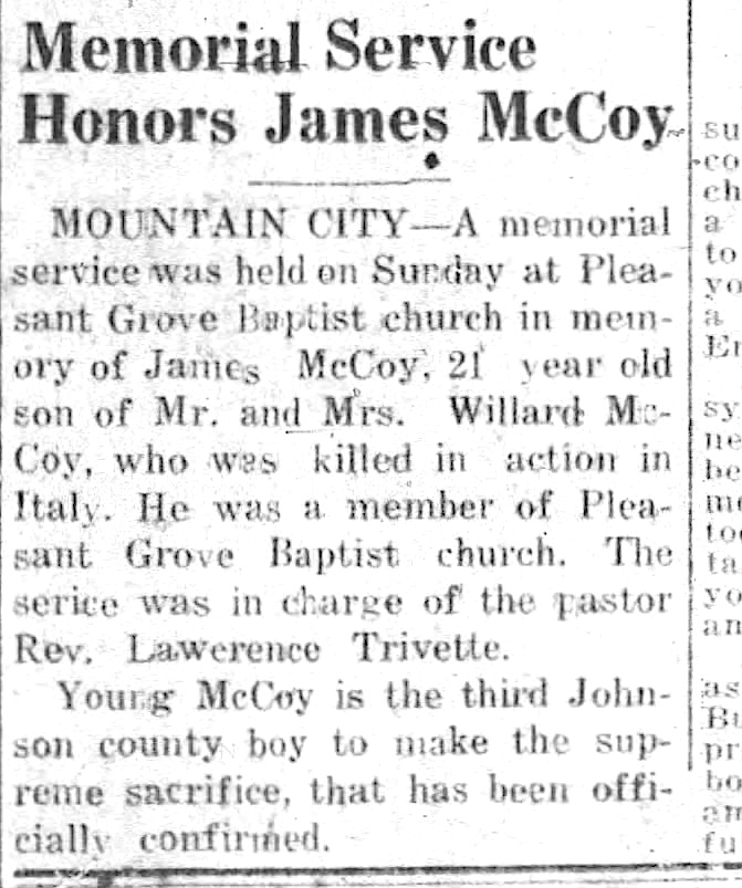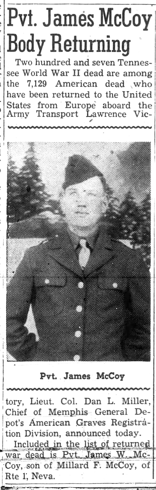 Pvt. James McCoy body returning. Two hundred and seven Tennessee World War II dead are among the 7,129 American dead who have been returned to the United States from Europe aboard the Army Transport Lawrence Victory, Lieut. Col. Dan L. Miller, Chief of Memphis General Depot’s American Graves registration Division announced today. Included in the list of returned war dead is Pvt. James W. McCoy, son of Miljard F. McCoy of Route 1, Neva.
