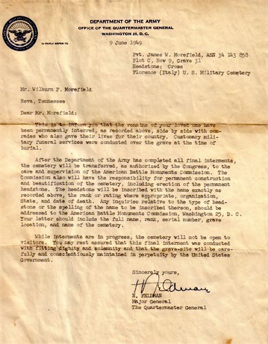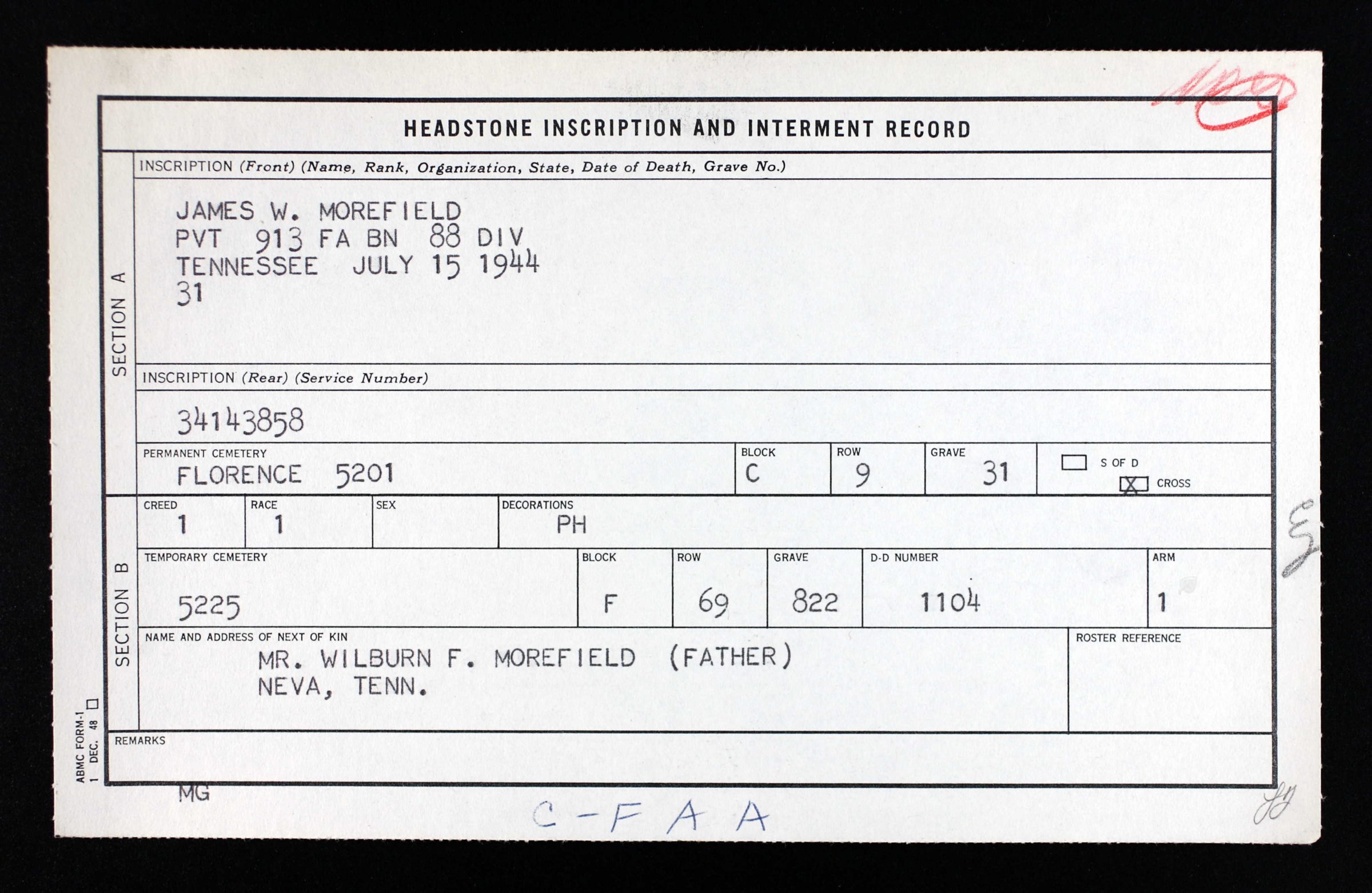 He was initially buried at Follonica Cemetery at Follonica, Italy and reburied at Florence American Cemetery, Via Cassia, Italy, C, 9, 31