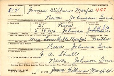 James Wilbur “Wib” Morefield was born in Neva, Johnson County, Tenn. to Wilburn Floyd Morefield and Lona Belle Forrester.
