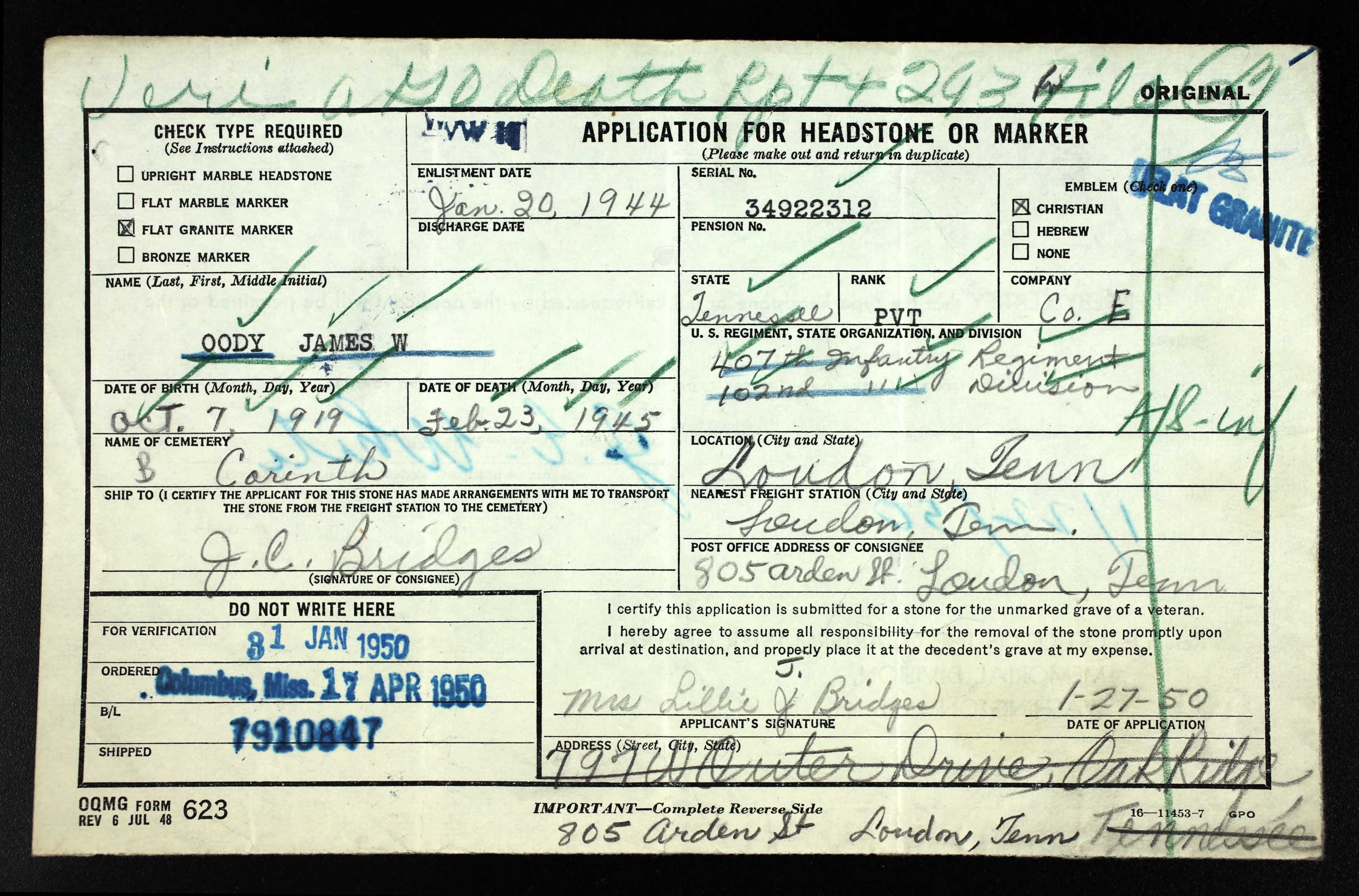 Pvt. James Walter Oody, husband of Mrs. Lillie Lindsey Oody, and son of Mrs. Edna Oody Grimes, of the Corinth Community, near Loudon, was killed in action February 23rd, 1945 in Germany. Pvt. Oody was fighting with the 9th Army in Germany. He entered the service in January 1944 and arrived overseas in December of that year.