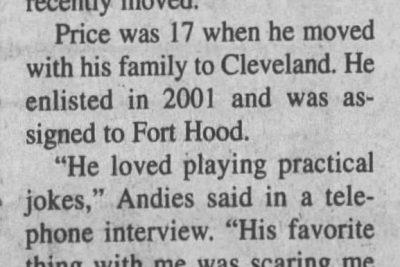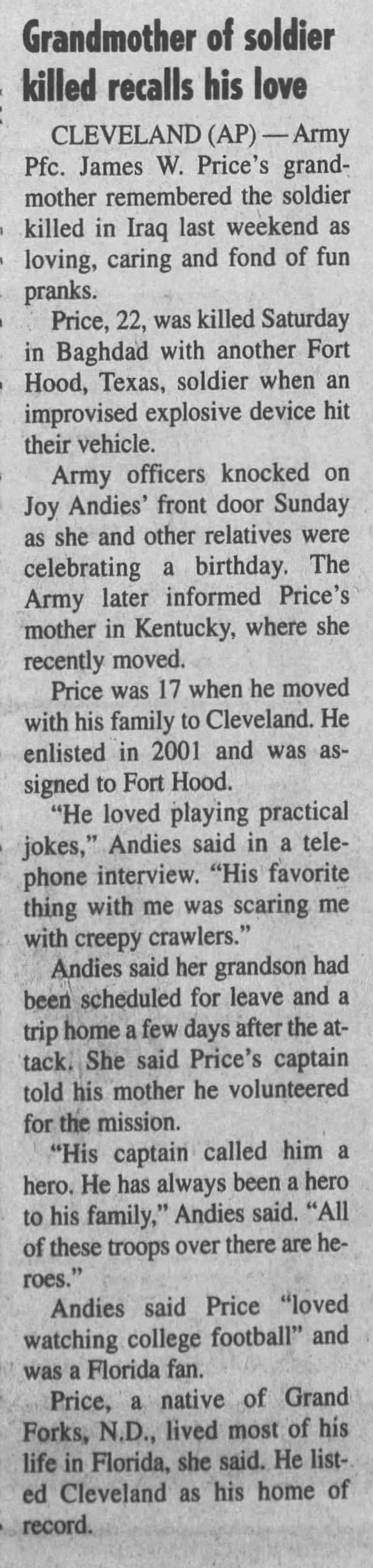 Army Pfc. James William Price, 22, of Cleveland, Tenn.; assigned to the 4th Battalion, 5th Air Defense Artillery Regiment, 1st Cavalry Division, Fort Hood, Texas; killed Sept. 18 when an improvised explosive device hit his convoy vehicle in Baghdad. Pfc. James W. Price of Cleveland, Tennessee attended Bushnell High School in Bushnell, Florida where he was a tuba player in the band and participated in track. He then attended Chattanooga State Community College in Chattanooga, Tennessee. James joined the Army as a communication specialist and served three-and-a-half years on active duty. Though he was a native of Grand Forks, North Dakota, he lived most of his life in Florida. His mother, Darlene Howell, lives in Kentucky. He is survived by his mother, Darlene Howell; a sister, April Howell, a brother, Joseph Howell; his maternal grandmother, Joy Andies; and his paternal grandmother, Freda Wender. He was preceded in death by his stepfather, Dudley J. Howell; his maternal grandfather, James Andies; and his paternal grandfather, Bill Price. He was killed at age 22 when an improvised explosive device hit his convoy vehicle in Baghdad. James was given full military honors and awarded the Purple Heart and the Bronze Star for his actions.