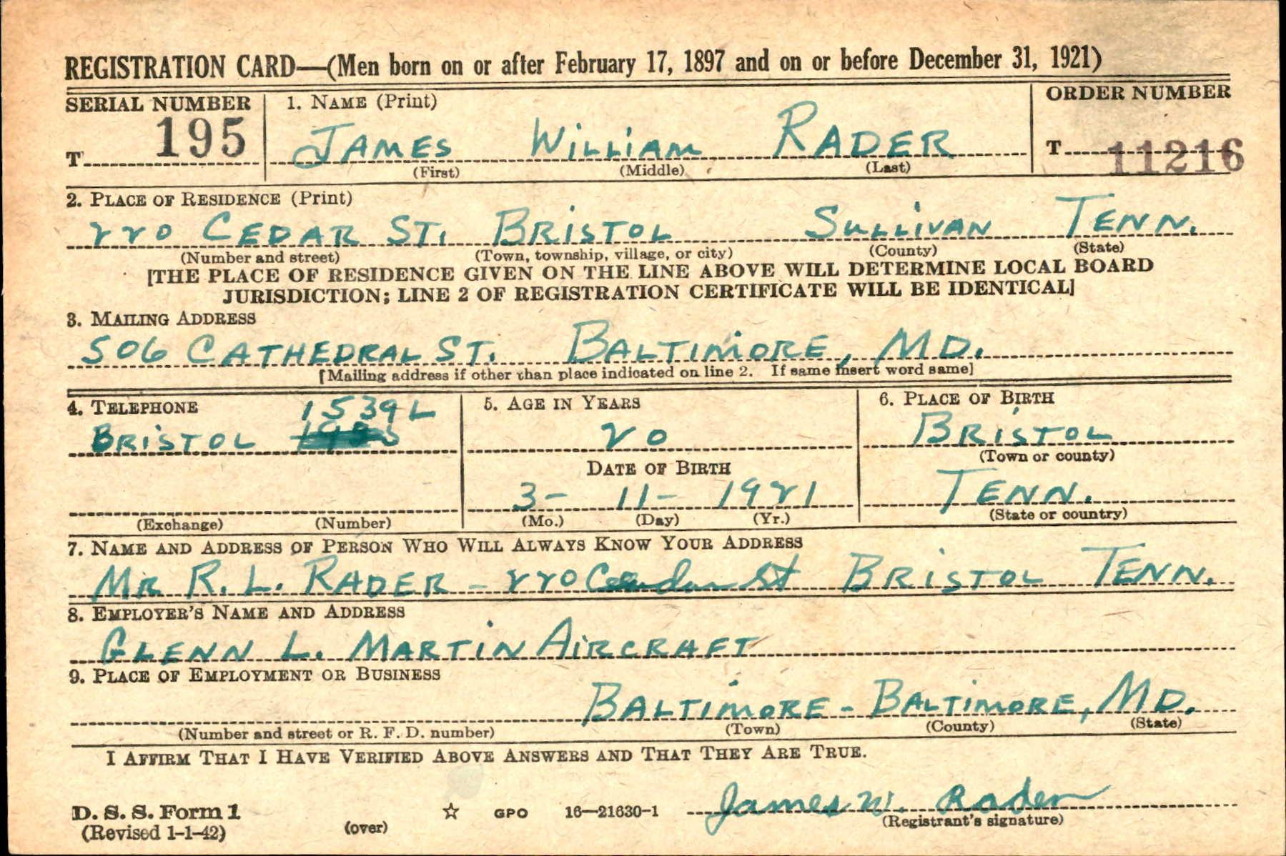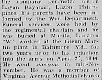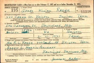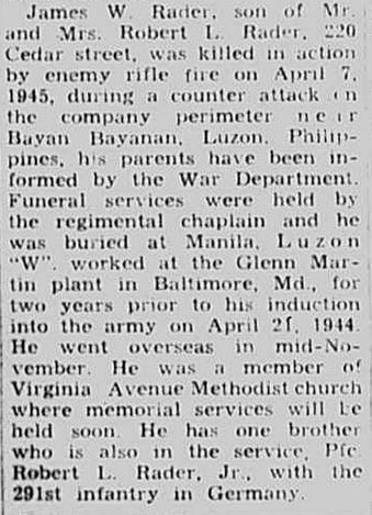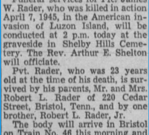 James William Rader was born in Bristol, Tennessee. He was the son of Robert Lee Rader en Luvene D. Rader. He had one brother, Robert Lee Rader Jr. PFC Rader enlisted on 21 April 1944 at Baltimore, Maryland. Killed in Action in the American Invasion of Luzon Island.