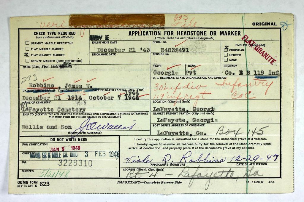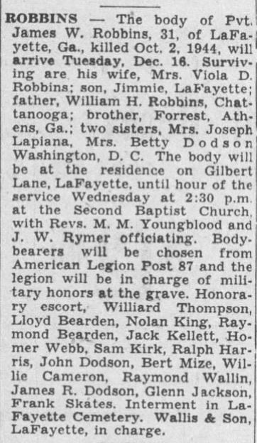 The bodyof Pvt. James W. Robbins, 31, of LaFayette, Ga., killed Oct. 2, 1944. Survivors are his wife, Mrs. Viola D. Robbins; son, Jimmie, LaFayette; father, William H. Robbins, Chattanooga; brother, Forrest, Athens, Ga.; two sisters, Mrs. Joseph Lapiana, Mrs. Betty Dodson, Washington, D.C. The body will be at the residence of Gilbert Lane, LaFayette, until hour of the service at the Second Baptist Church. Interment in LaFayette Cemetery, Wallis & Son, LaFayette, in charge.