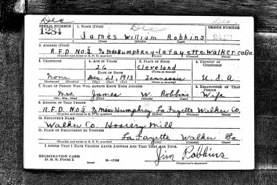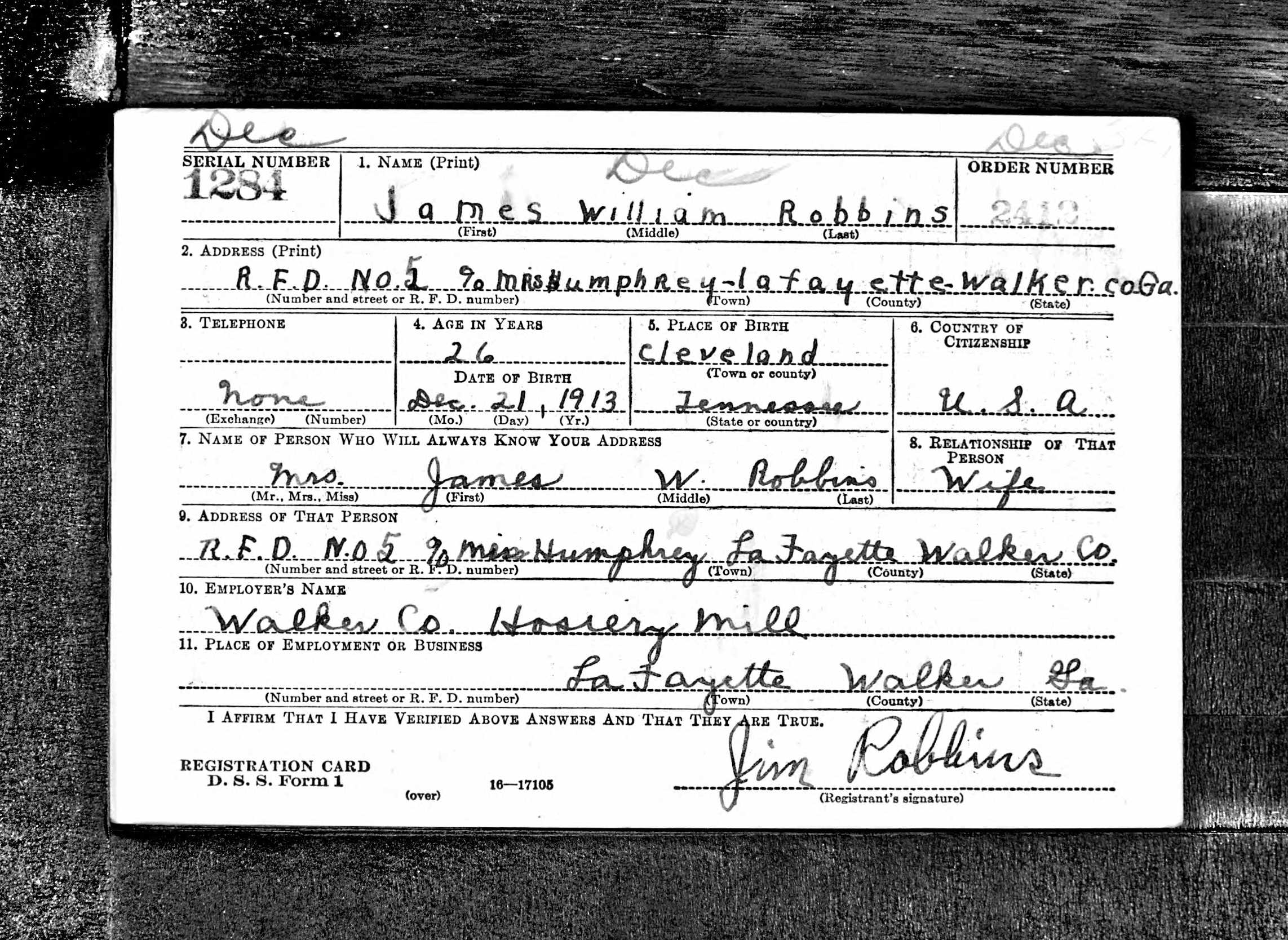 James William Robbins was born on 21 December 1913 in Cleveland, Tennessee, the son of William Harrison Robbins and Nora Frances Penland. He was married to Viola Beatrice Day. He resided at Walker County, Georgia at the time of his enlistment.