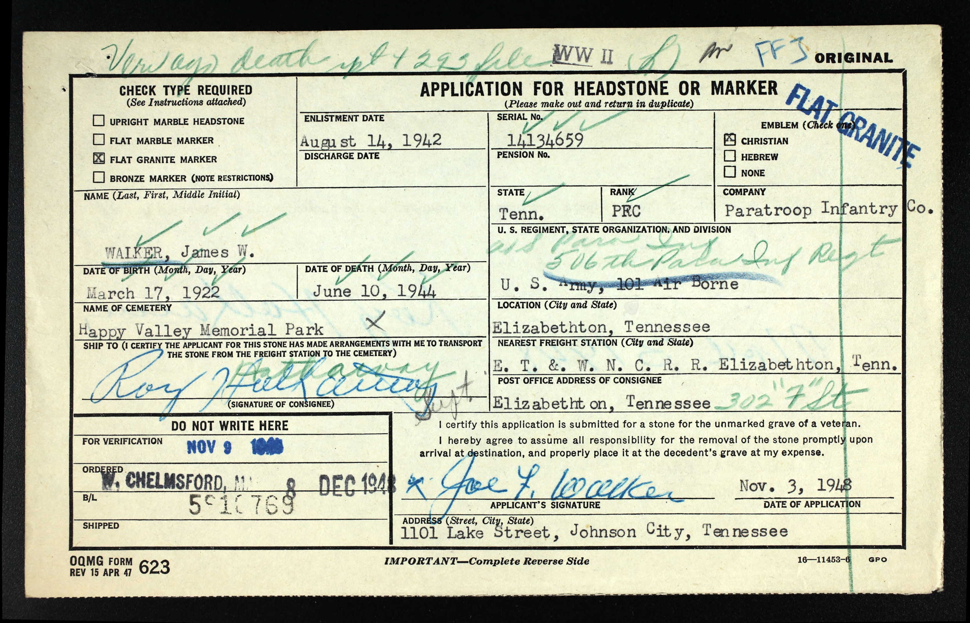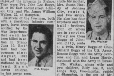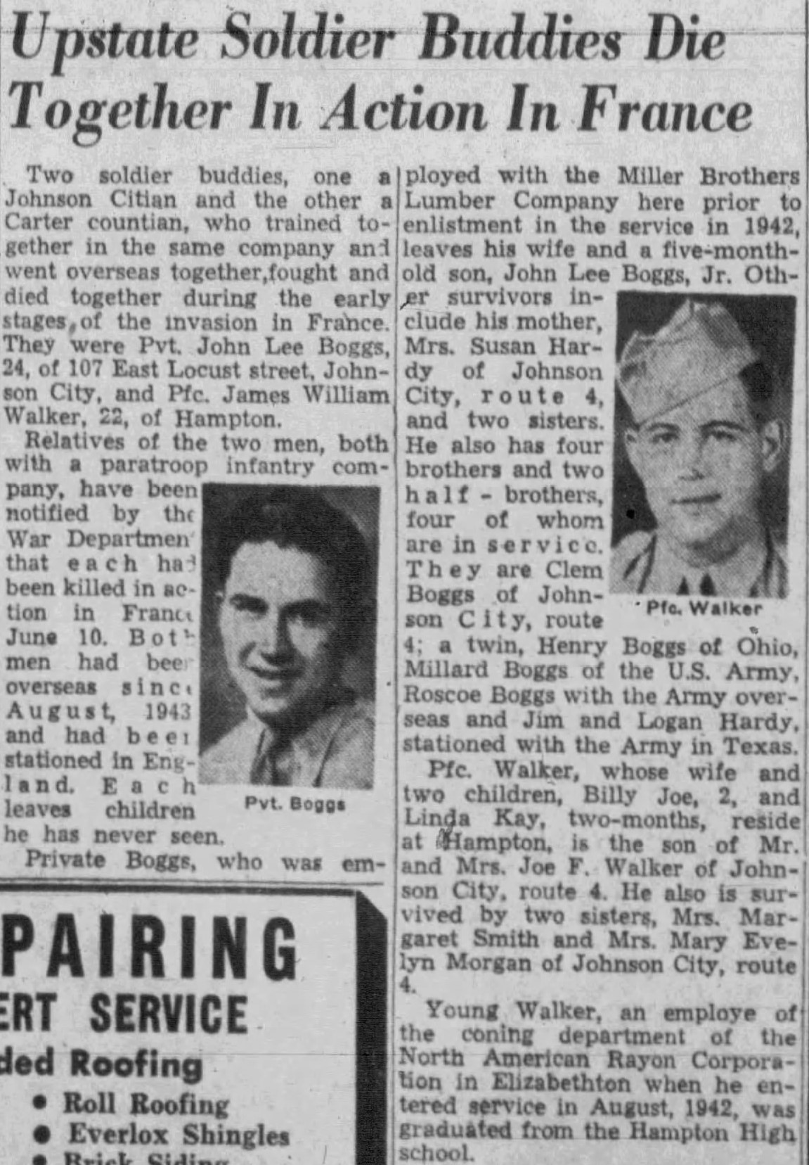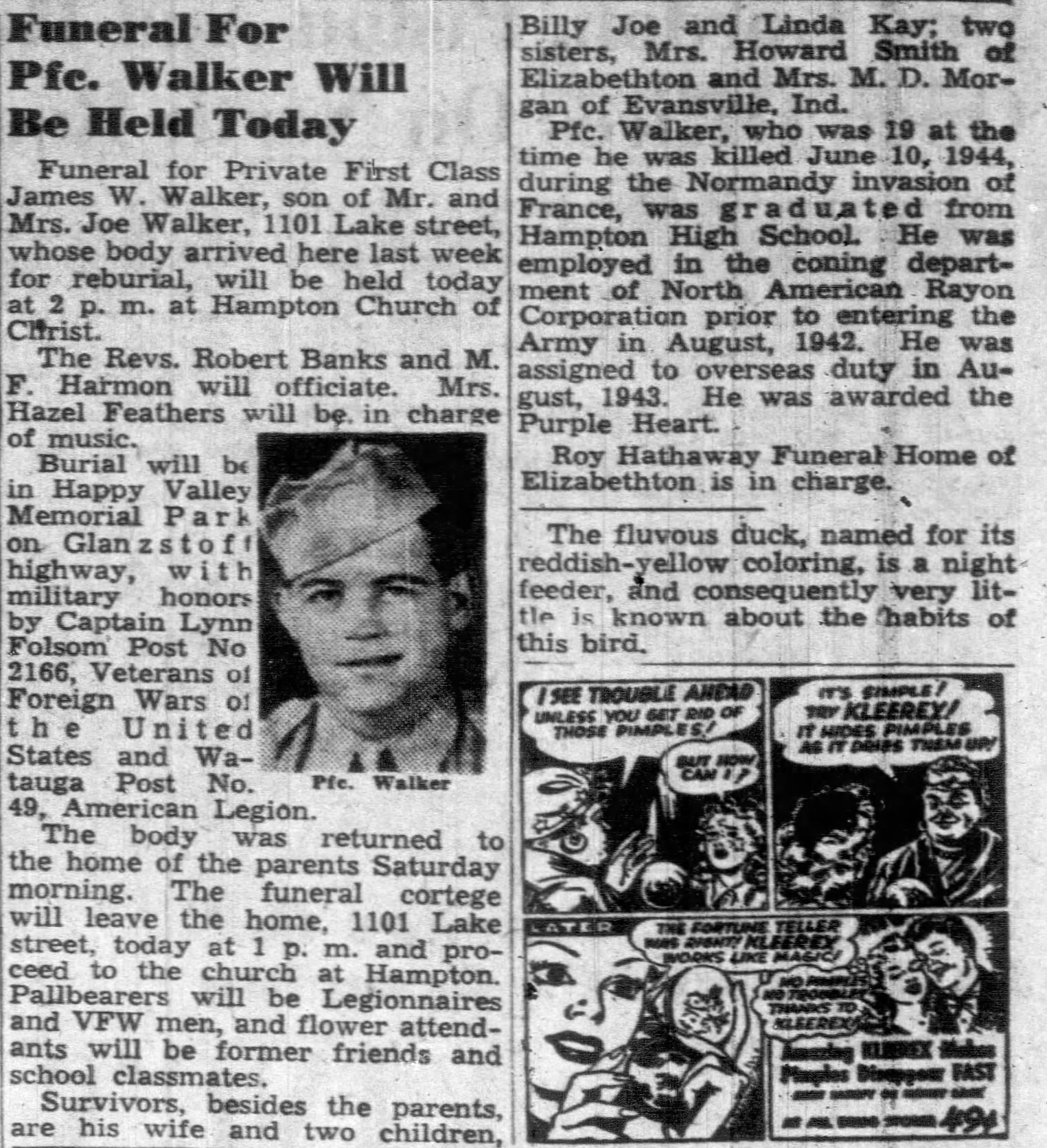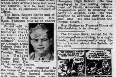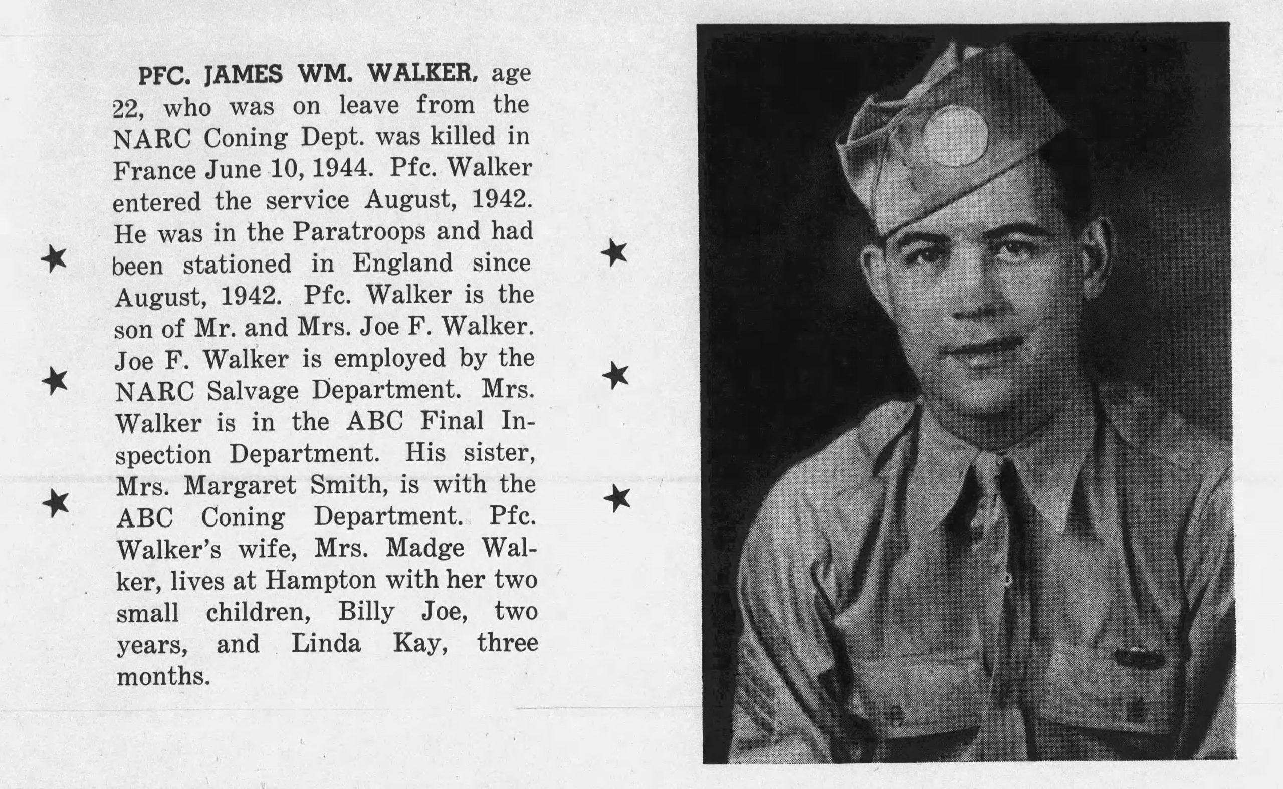 Pfc. Walker was graduated from Hampton High School and was a member of the Christian Church. He was employed in the coning department of North American Rayon Corportation prior to entering the Army in August, 1942. He was assigned to overseas duty in August, 1943, stationed in England. His father Joe F. Walker was employed by the NARC Salvage Department. His mother with the ABC Final Inspection Department. He sister, Mrs. Margaret Smith was with the ABC Coning Department. His wife, Mrs. Madge Walker lived at Hampton with her two small children, Bill Joe, two years and Linda Kay, three months.
