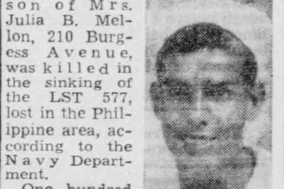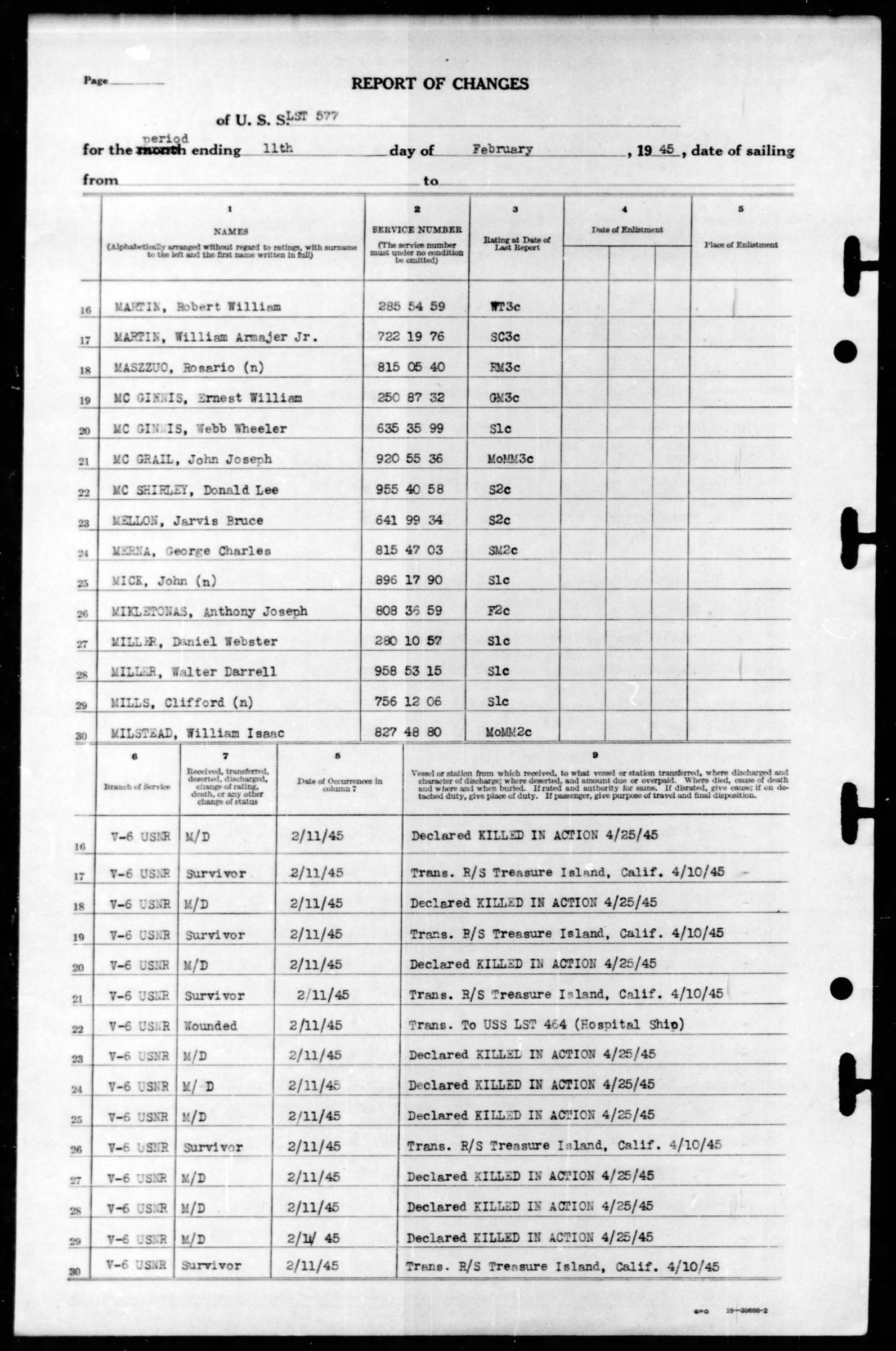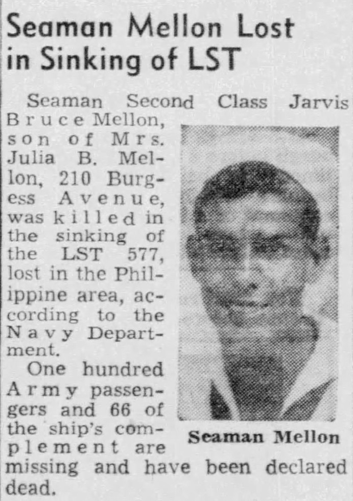 Jarvis Mellon served on the LST 577. He was Missing in action on 11 February 1945 and declared Killed in Action on 25 April 1945. He was awarded the Purple Heart.