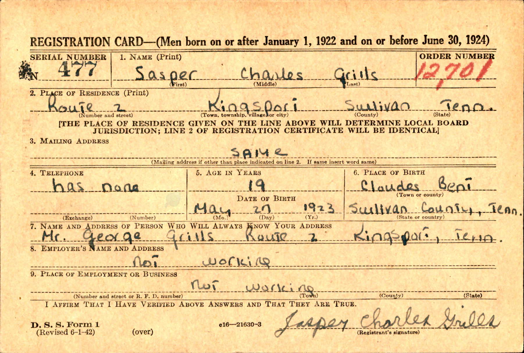 Jasper Charles Grills was born at Cloudes Beni, Tennessee, the son of John E. Grills and Fannie Hutchins.