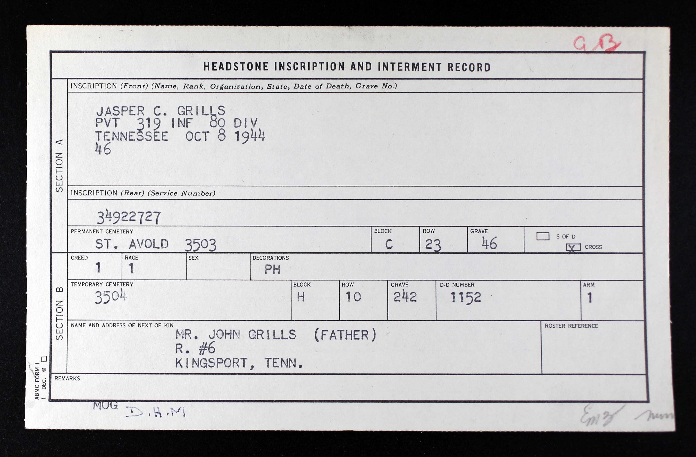 Private Jasper C. Grills #34922727 US Army was assigned to the 319th Infantry Regiment, 80th Infantry Division.