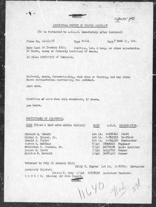 Aircraft B-24L with serial number 44-41438 took off from Luliang, China on a ferry trip to Suichwan, China, at 1650 hours, 20 January 1945. The A/C was shot down at 2010 about 10 Miles northwest of Suichwan, China.