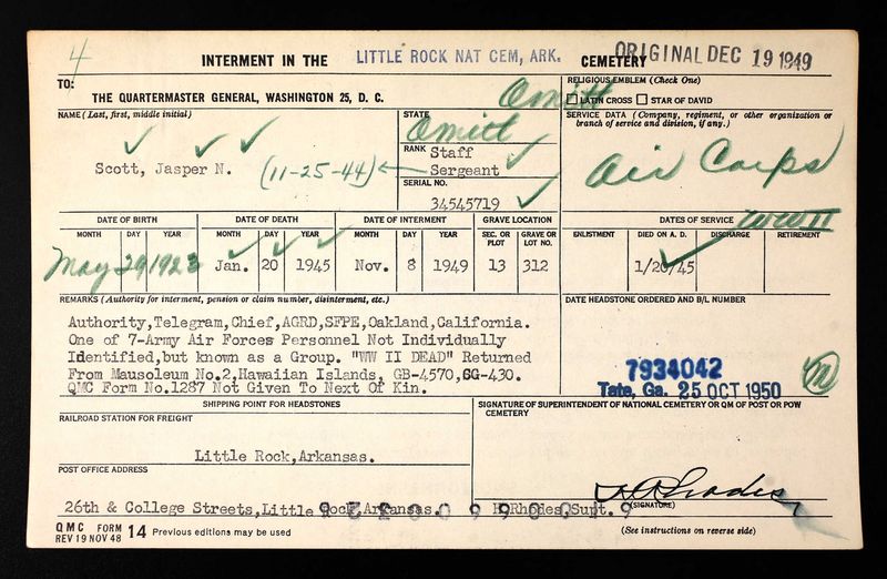 Group burial for this US Army Air Corps flight crew who died on January 20, 1945 during World War II. Their remains were interred here on November 8, 1949: Little Rock National Cemetery, Section 13 Site 312.