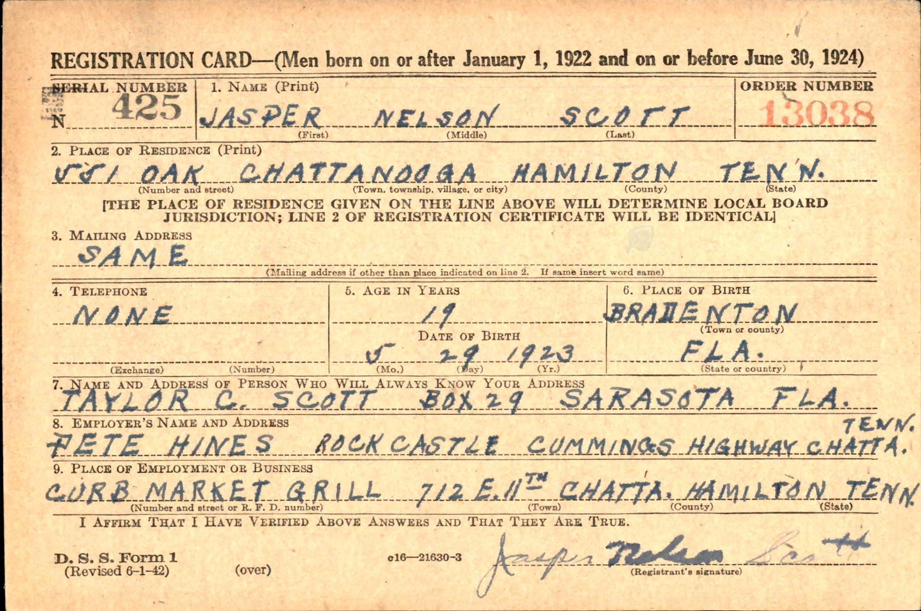 Jasper Nelson “Jack” Scott was born in Bradenton, Florida, son of Taylor Carver Scott and Edith Harper. He had two brothers, Lt. Taylor C. Scott Jr. and Thomas E. Scott. He was graduated from Sarasota High School and attended the University of Chattanooga, one and one-half years. He entered the service March 5, 1943.