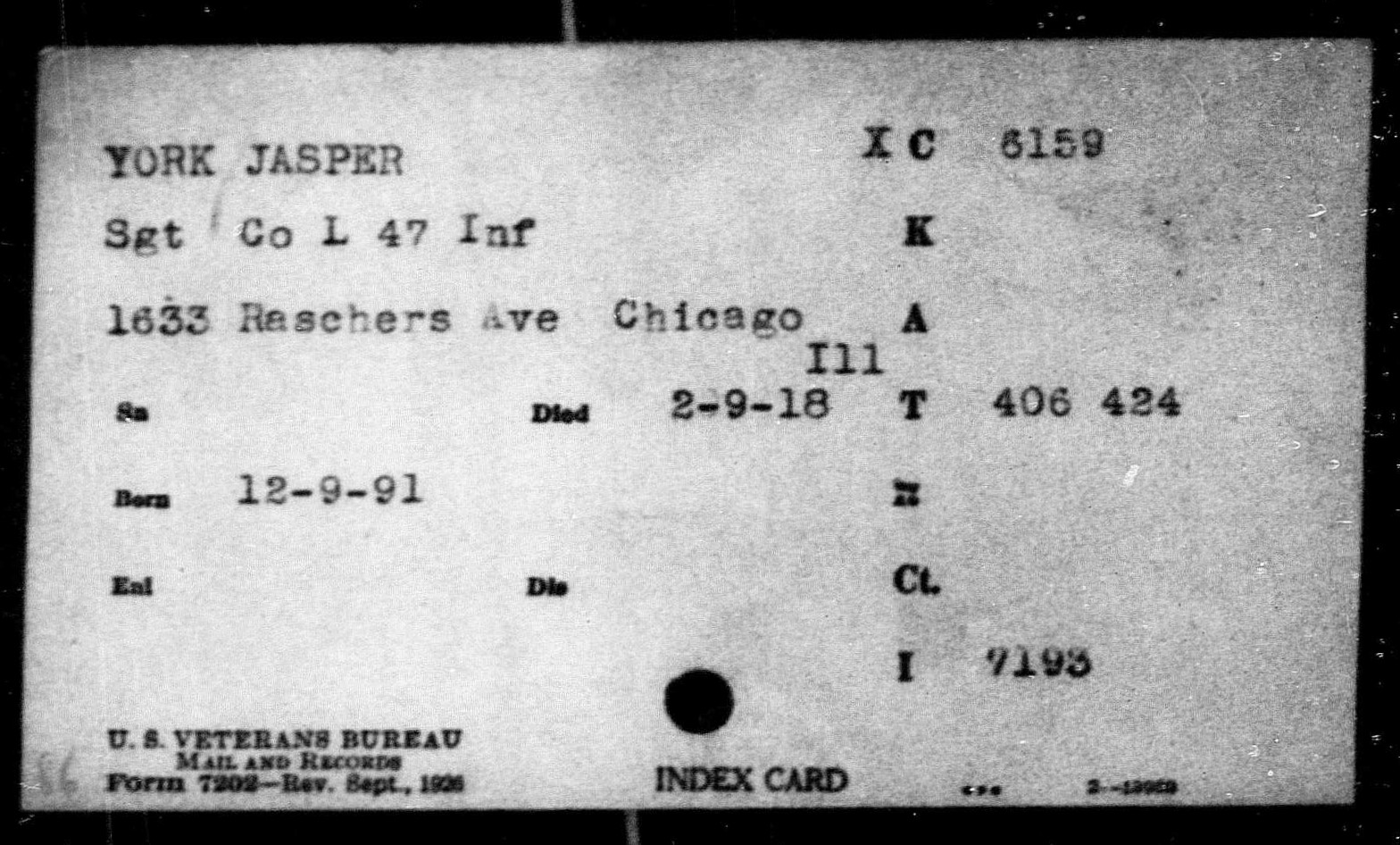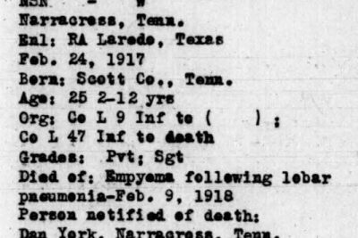 Jasper York of Scott County was a Sergeant with Company L of the 47th Infantry Regiment, 4th Infantry Division. York developed influenza and died as a result of pneumonia at Camp Greene Base Hospital in Charlotte, North Carolina, prior to being deployed to active battle in Europe. According to his grandnephew Leo York, “Jasper York was born in December 1891 in Cordell, Scott County, to Andrew and Lucinda Newport York. He was one of nine brothers all serving in the U.S. military in all branches during the Spanish-American War, WWI and/or WWII. He was unmarried. When he died February 9, 1918, his body was shipped home and was interred in the York Cemetery in Cordell.”