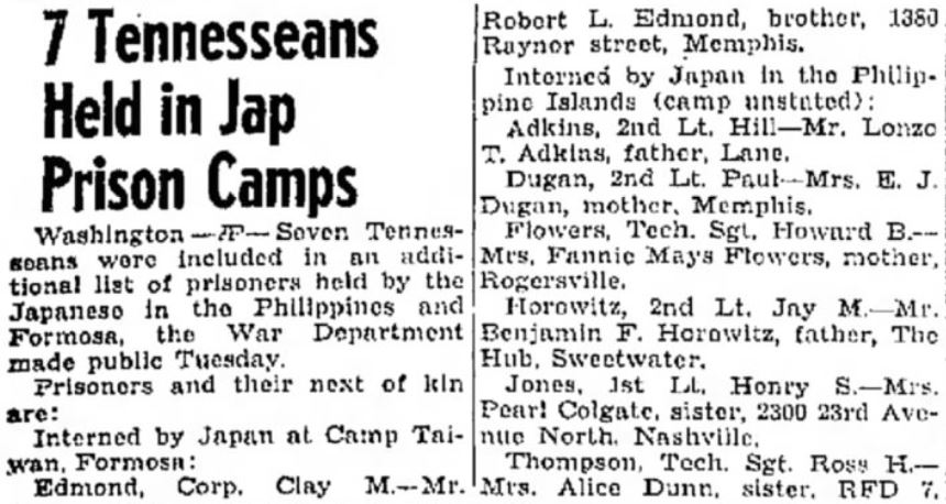 Jay would find himself moved to the Cabanatuan Prison Camp where he would watch many more friends and prisoners suffer and die over the next 32 months. The only correspondence Jay was ever able to get out was during this time. The Knoxville News Sentinel reported on August 28, 1943 that Jay had penned a letter to his parents. He told them he was well and was treated fair. I wonder if this was a comfort to his mother or did she know the real truth behind the censored letter? Still Jay survived.
