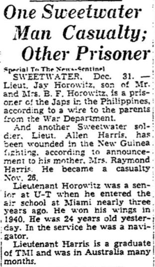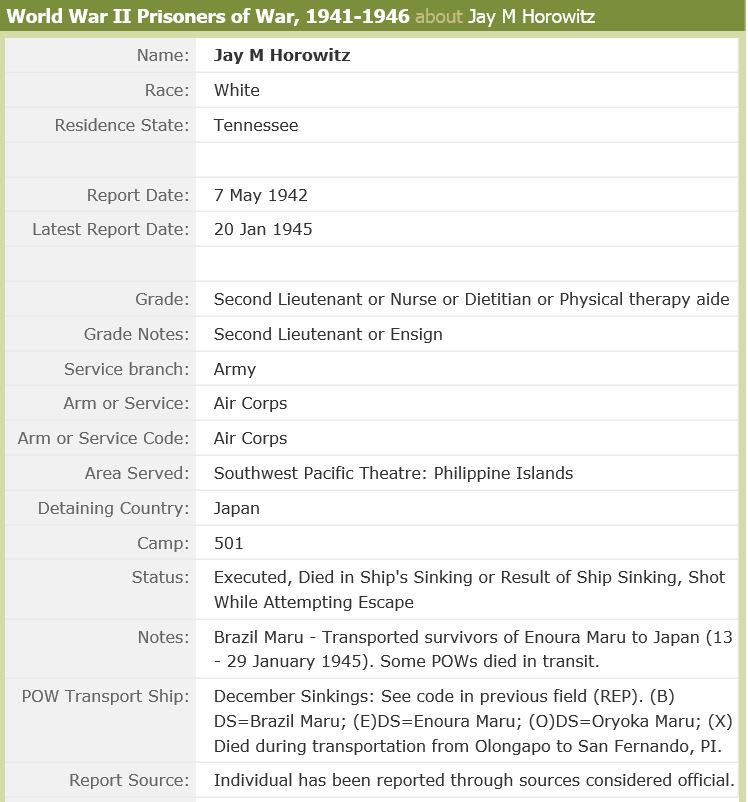 2nd Lt Jay Malcolm Horowitz was taken Prisoner of War at the fall of the Philippines. He was transported aboard the Oryoku Maru to Japan where he died 20 January 1945.