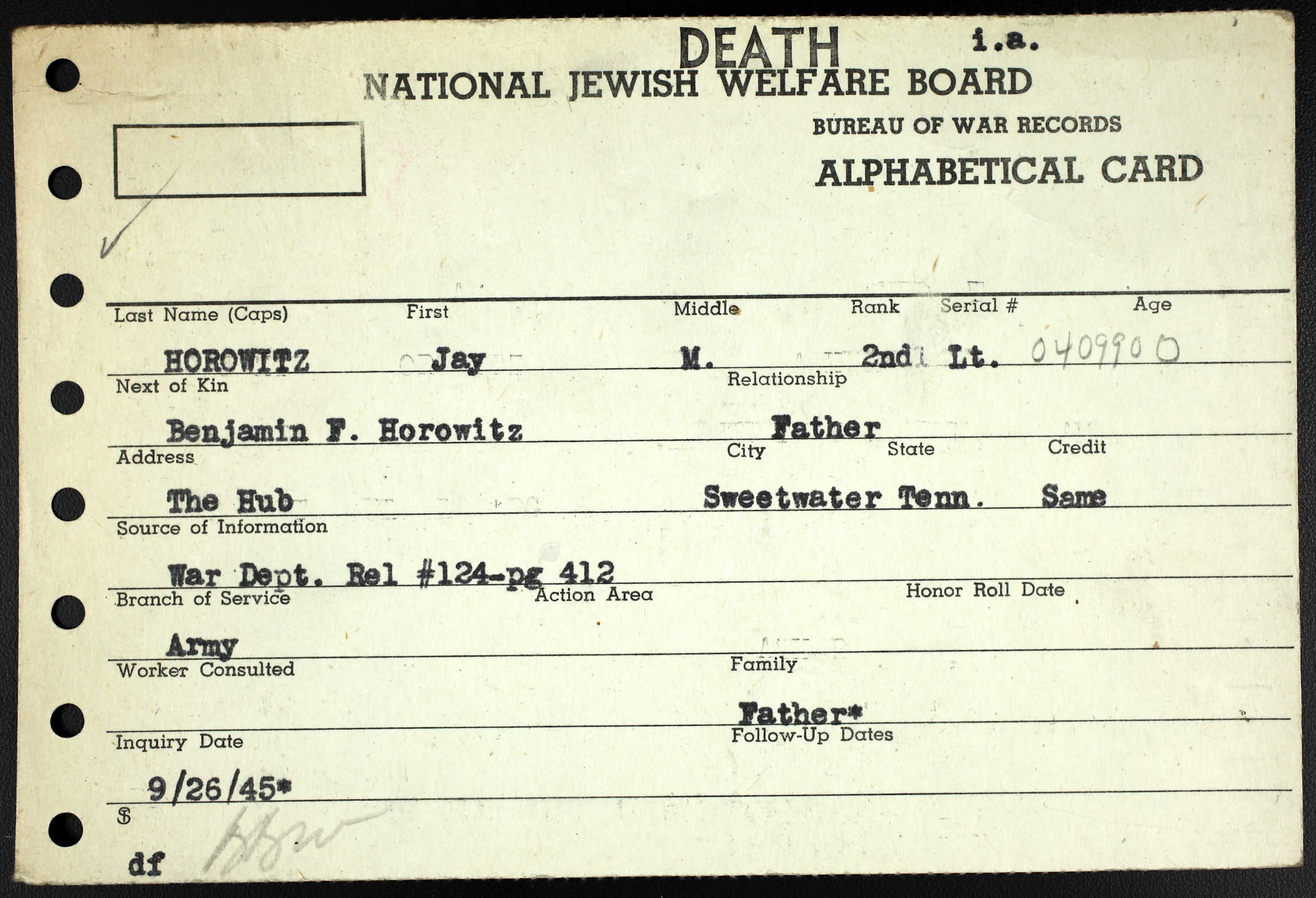 Jay Malcolm Horowitz was, as his friends described him, the happy Jewish boy from Sweetwater, Tennessee. Born December 30, 1918 and raised in Brooklyn, New York. He was the son of Benjamin F. Horowitz and Ruth R. Cahn Horowitz. He was born with Russian, German, Austria, and New York descent. He was one of two sons born to Ben and Ruth. His father was a clothing merchant in New York and moved to Sweetwater, Tennessee where Jay graduated Sweetwater High School May 23, 1936. By August 1936 he was enrolled at the University of Tennessee.