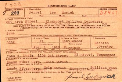 Jerrel Lee Musick was born on 4 January 1920, the son of Elexious Worley Musick and Gracie Cora Couch. Husband of Virginia Catherine Davis and father of Bennett Lee Musick.