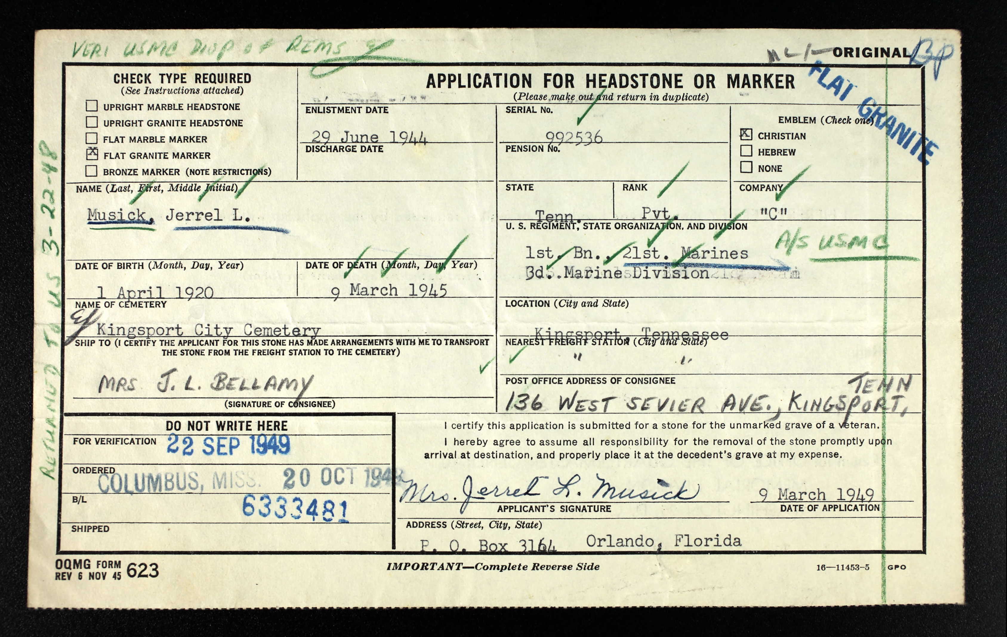 He enlisted in the Marine Corps June 29, 1944, and took his training at Parris Island, SC. Later he was transferred to Camp Lejeune, NC, and from there to the Pacific. He was wounded by enemy mortar barrage on March 8, 1945, on Iwo Jima and died the next day.