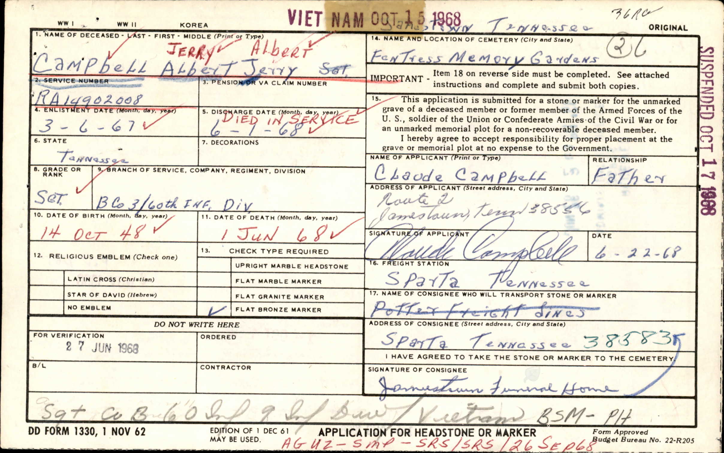 Jerry Albert Campbell was the son of Claude Cyrus Campbell and Willie Scroggins.