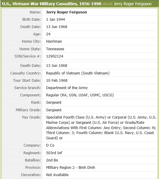 Jerry and I were married almost four years when he was Kia in Binh Dinh Vietnam. His best buddy was Kia 13 March 1968 and Jerry was his escort in he got to stay till 13 April found out I was pregnant 13 May 68 and Jerry was Kia 13 June 68. We had a son and was named after Jerry and David Lee (Toby) Edney. Jerry Lee.